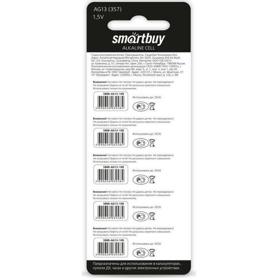 Элементы питания SMARTBUY (SBBB-AG13-10B) AG13-10B в упаковке 10шт (цена за 1шт)