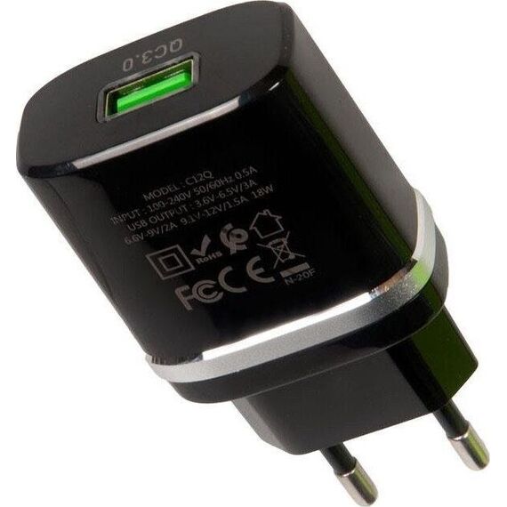 Вход: AC100-240V, 50/60Hz, 0.5A. Выход: 3.6V-6.5V/3A, 6.6V-9V/2A, 9.1V-12V/1.5A, 18W. EU штекер. Материал: огнеупорный PC + ABS. Поддержка быстрой зарядки для QC3.0/QC2.0. Набор с зарядным кабелем Type-C 1м. Размер: 86*44*26мм. Вес: 64г.