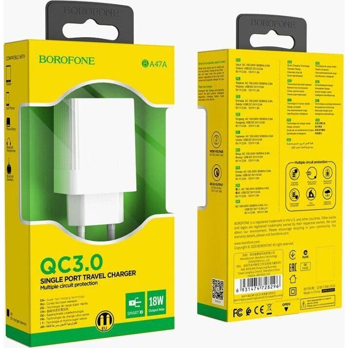 СЗУ BOROFONE (6931474728296) BA47A Mighty 1USB QC3.0 белый