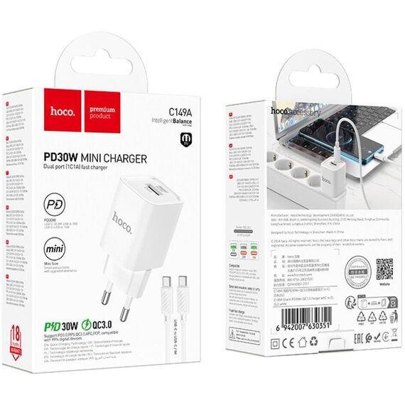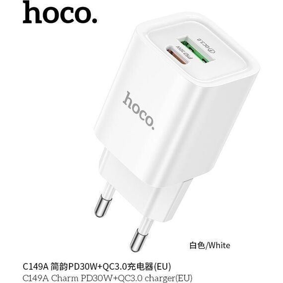СЗУ HOCO (6942007630337) C149A СЗУ 1USB+1Type-C 3.0A PD 30W+QC3.0 , White