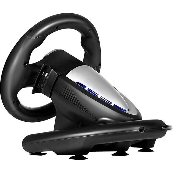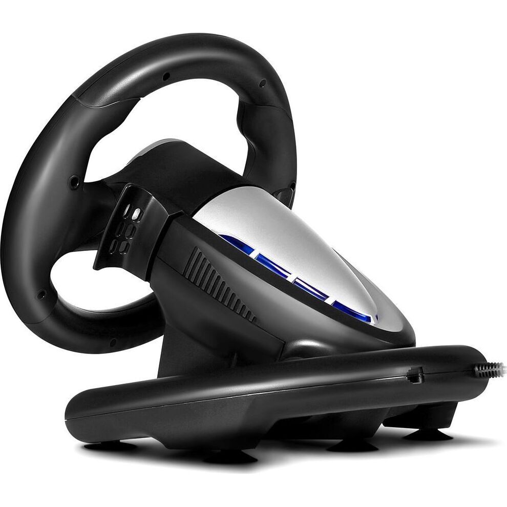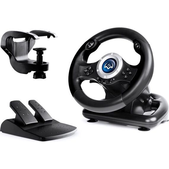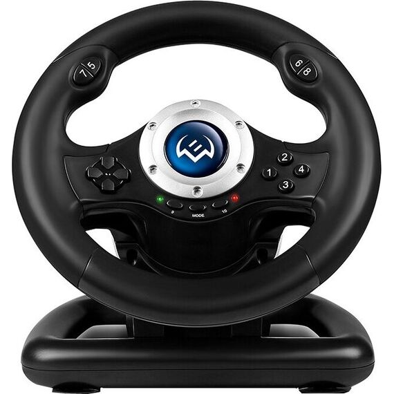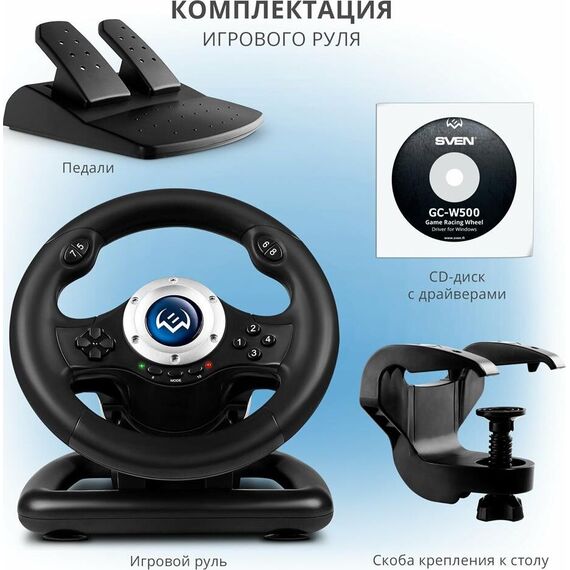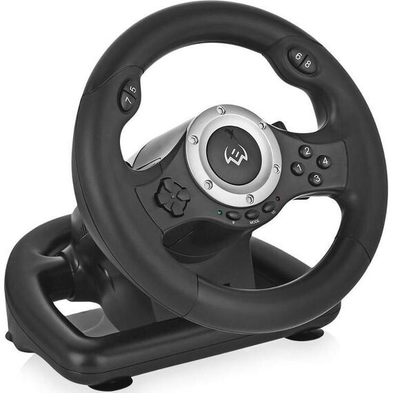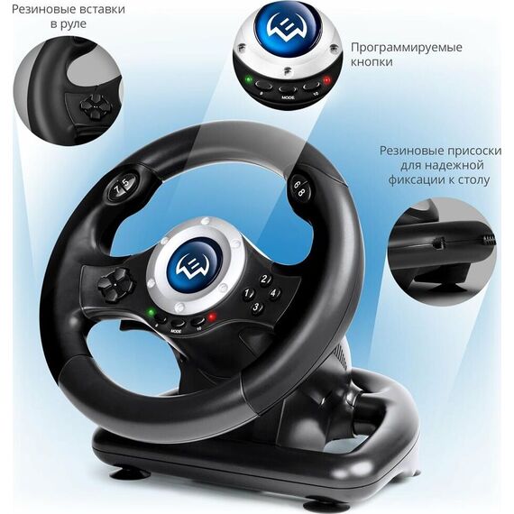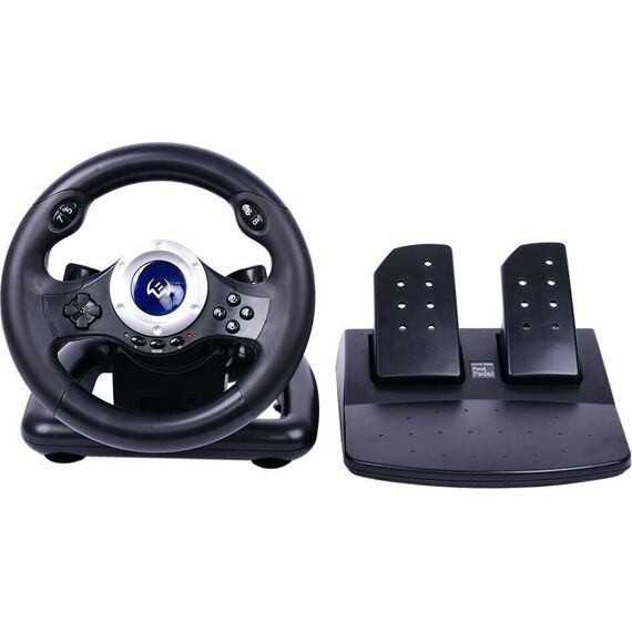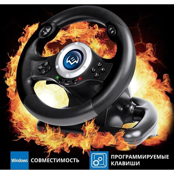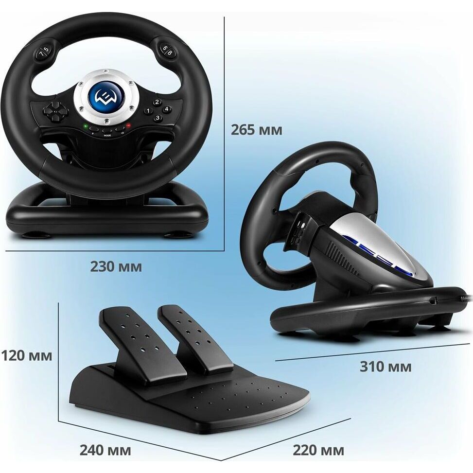 Игровой руль, диаметр руля – 9,5” (240 мм), угол поворота – 180 градусов поддержка: directx 7.0 и выше, windows xp/vista/7/8, интерфейс usb, функция виброотдачи для повышения реалистичности во время игры две оси, 8-позиционный джойстик и 10 дополнительных кнопокрезиновые вставки в руле для комфортного вождения, резиновые присоски и скоба для надежной фиксации к столу, работа в цифровом и аналоговом режимах, педали в комплекте.