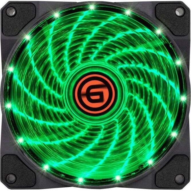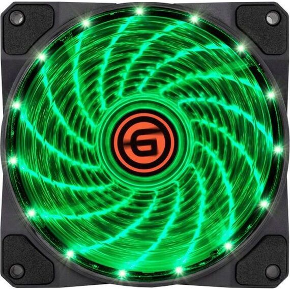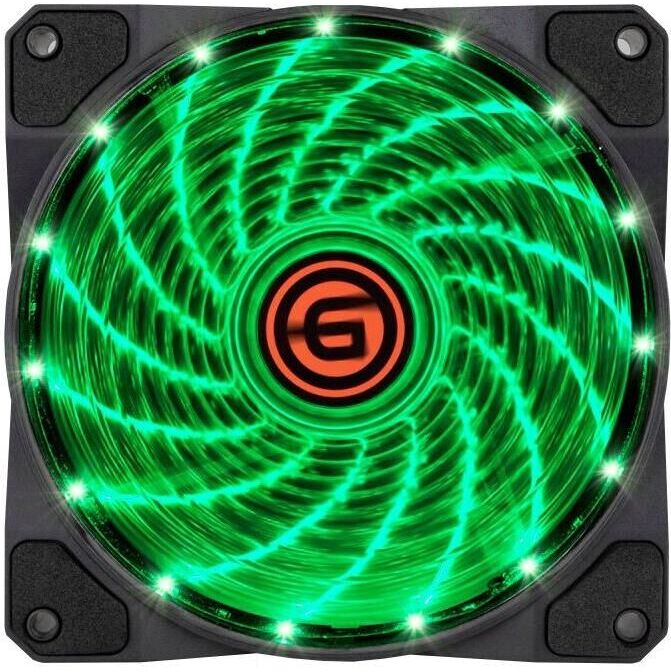 Вентилятор 12 см с LED подсветкой зеленого цвета. Количество светодиодов 15. Антивибрационные прокладки.