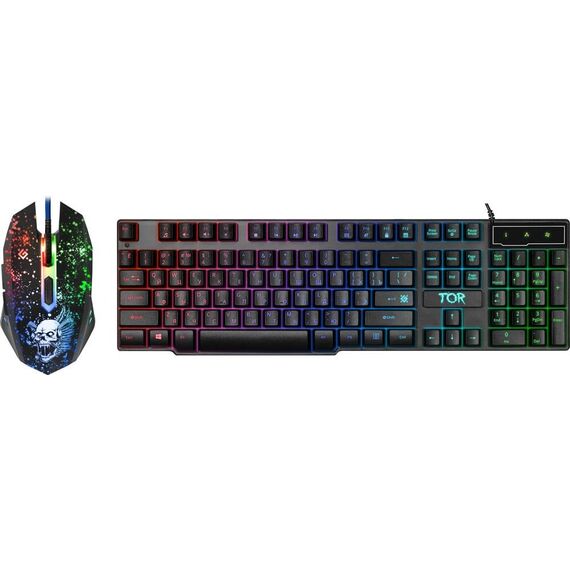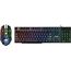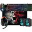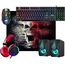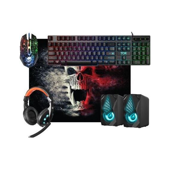 Игровой набор (5 в одном) - клавиатура+мышь+гарнитура+ акустика+ коврик, проводной, интерфейс USB; клавиатура - мембранная, количество клавиш - 104, длина кабеля - 1,5 м; мышь - оптическая, количество кнопок - 5 + колесо-кнопка изменяемое разрешение - 800/1800/2400/3200 dpi; гарнитура - импеданс (наушники) 32 Ом, чувствительность наушники/микрофон - 110±3 дБ/42±3 дБ, частотный диапазон наушники - 20–20000 Гц, длина кабеля -1.8 м; акустика - Суммарная выходная мощность (RMS) 6 Вт, диапазон частот 90–20000, тип интерфейса 3,5-мм джек; коврик - размер 280*230*3, материал - термически обработанная ткань + натуральная резина, поверхность Speed.