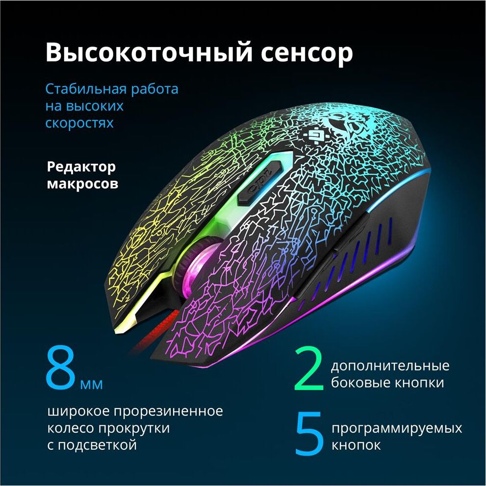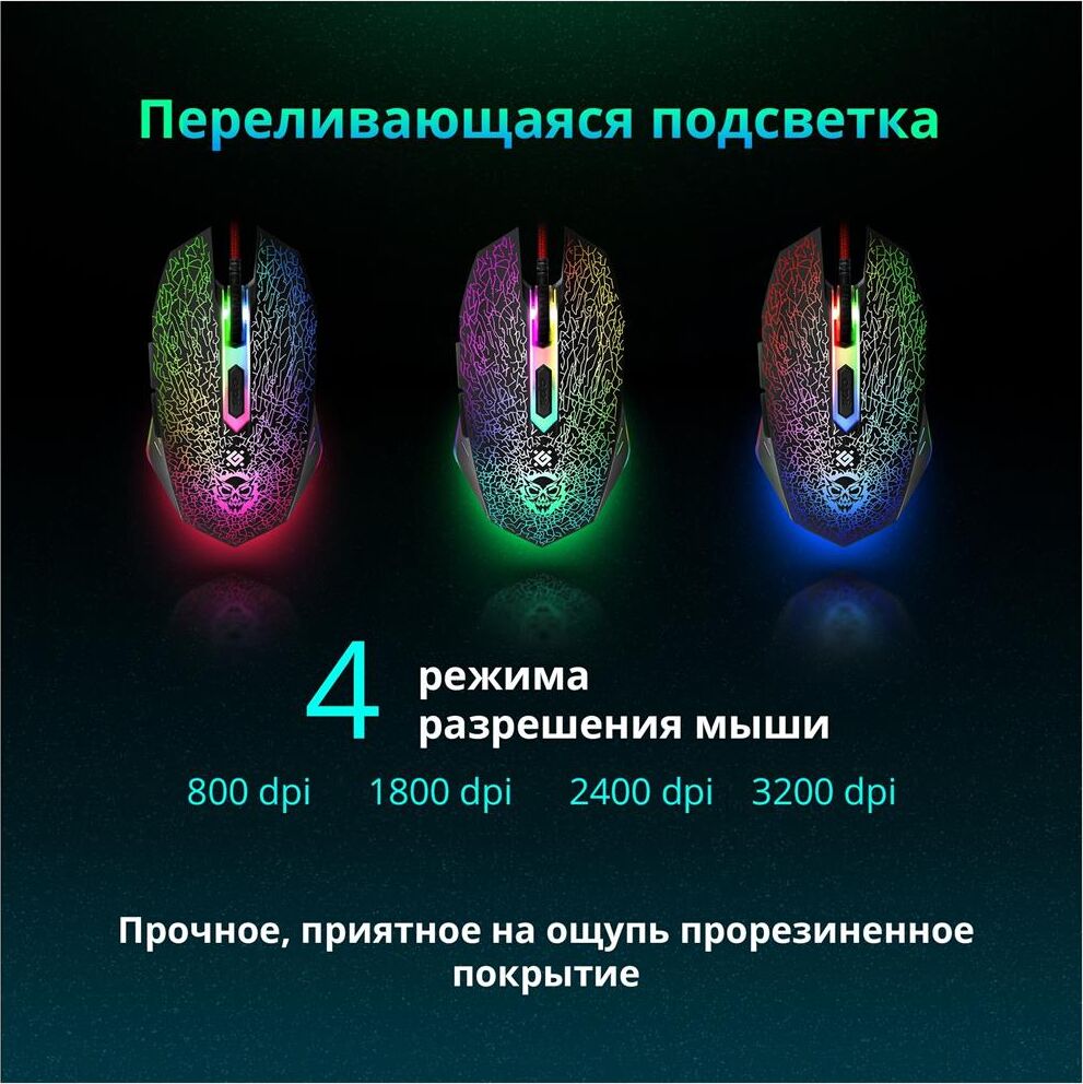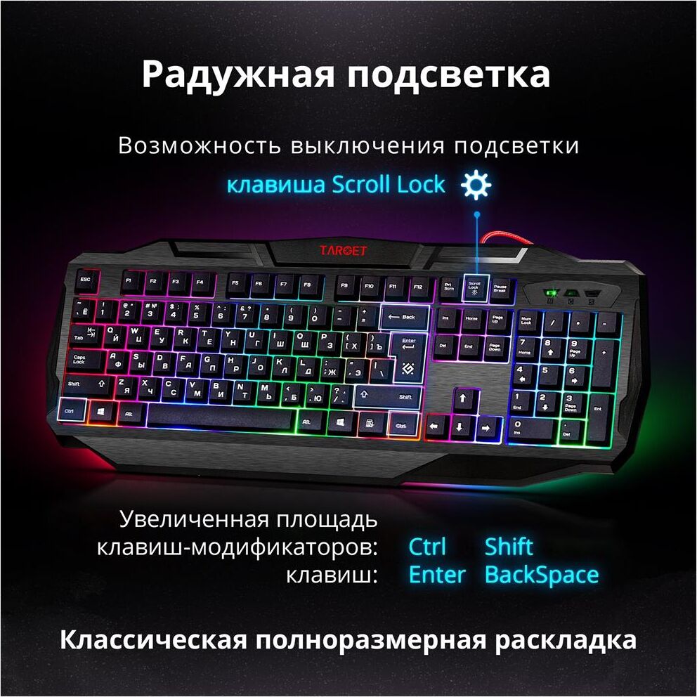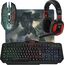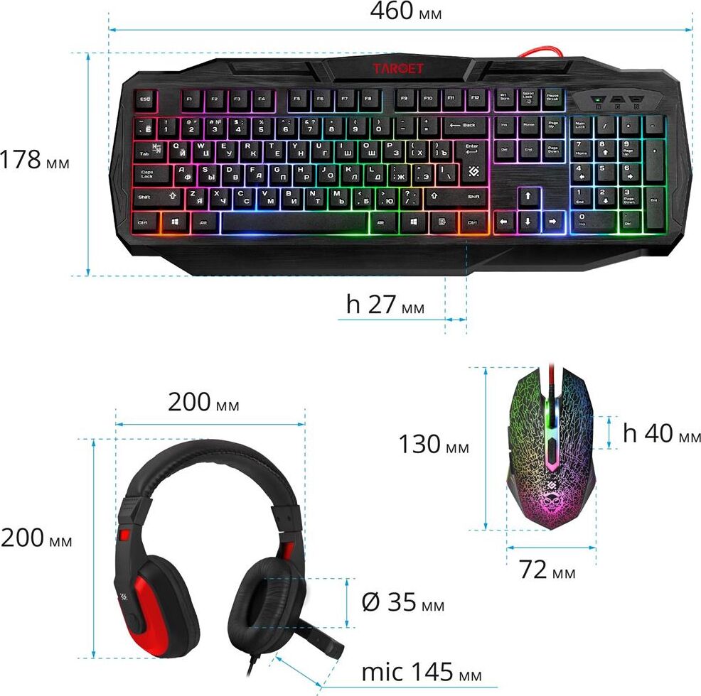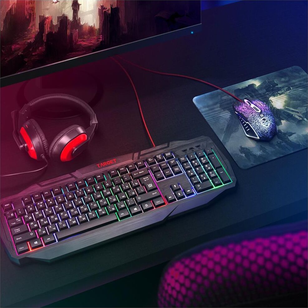 Геймерский набор 4-в-1 (гарнитура+клавиатура+мышь+коврик), гарнитура - импеданс (наушники) - 32, импеданс (микрофон) - 2.2, чувствительность (наушники) 110±3, частотный диапазон (наушники) - 20–20000 Гц; мышь- проводная оптическая, интерфейс подключения - USB, количество кнопок - 5 + колесо-кнопка, разрешение - 800/1800/2400/3200 dpi, эмуляция клавиш; клавиатура - ударопрочная, 104 клавиши, радужная подсветка; коврик - 280 х 230х 3 мм, материал - термически обработанная ткань + натуральная резина, поверхность Speed.