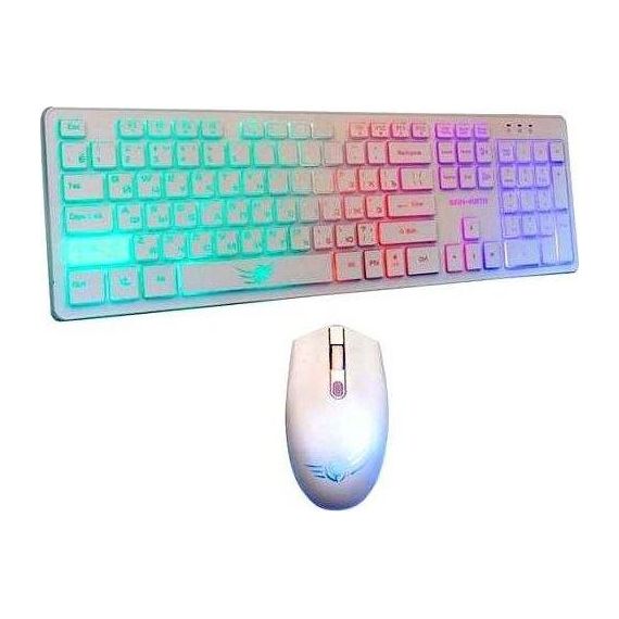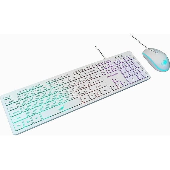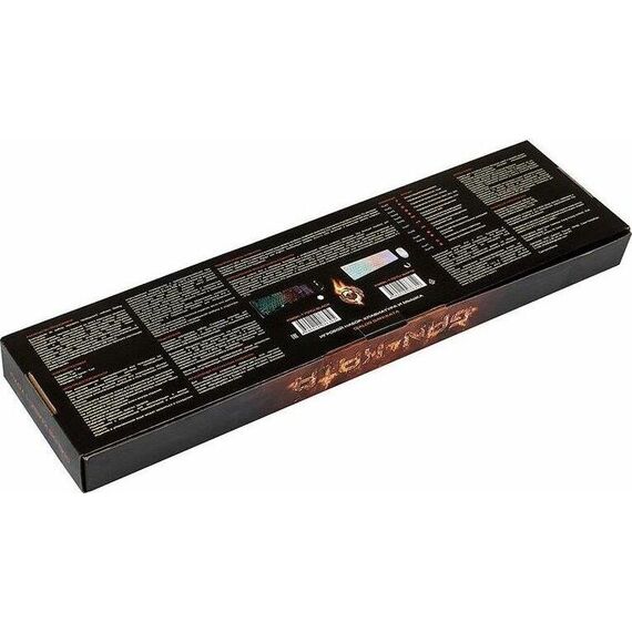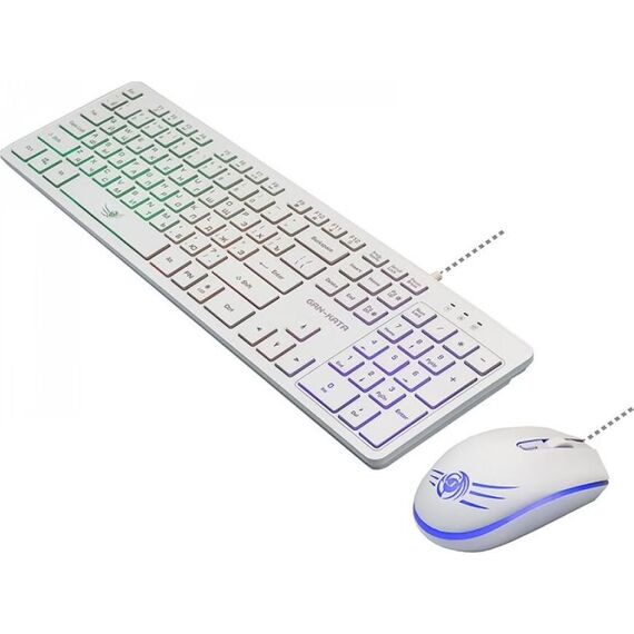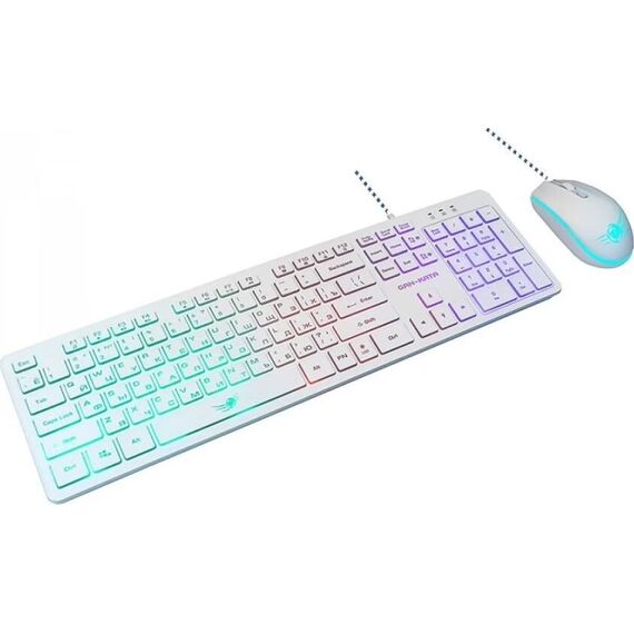 Игровой набор (клавиатура+мышь) мультимедийный, проводной, интерфейс USB, клавиатура - количество клавиш - 104, клавиши Windows, мультимедиа клавиши совмещённые с F-клавишами (активируются клавишей Fn), изменяемый угол наклона, длина кабеля - 1,5м; мышь: оптическая, количество кнопок - 4, колесо прокрутки, изменяемое разрешение - 1600/400/800/1200 dpi, максимальное разрешение мыши в CPI - 1600, длина кабеля - 1,5 м.