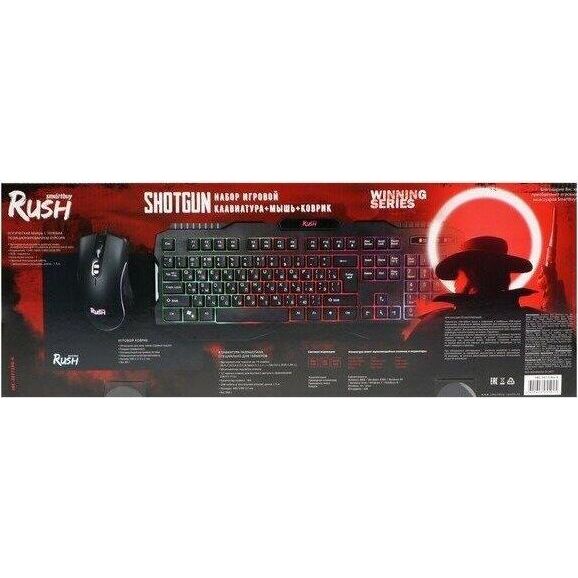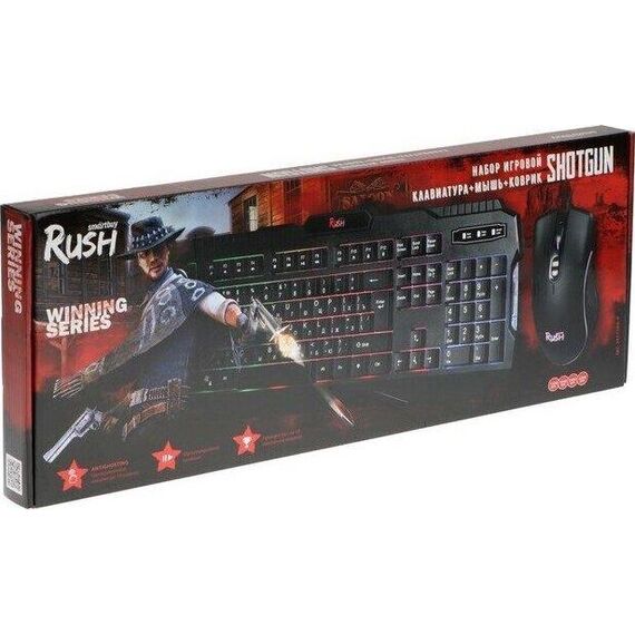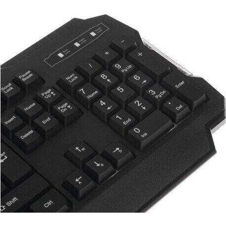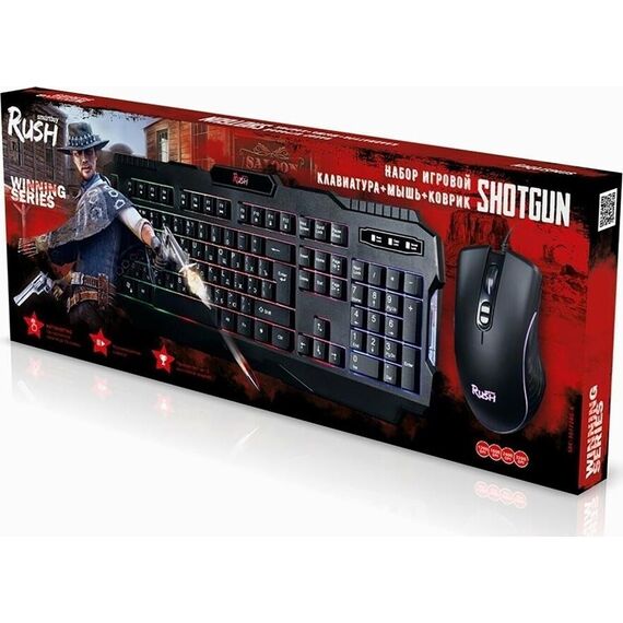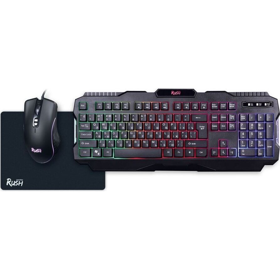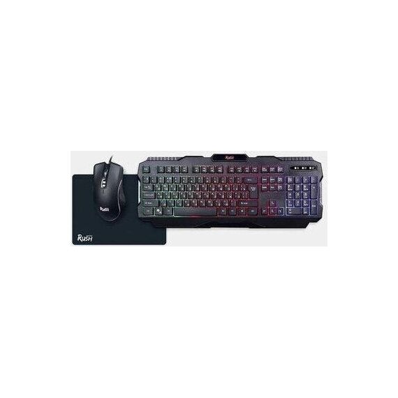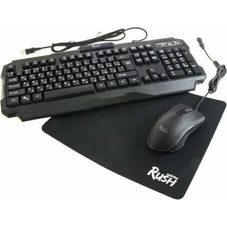Набор игровой 3 в 1 (клавиатура+мышь+коврик), проводной, клавиатура : количество клавиш - 104, горячих клавиш для быстрого доступа - 12, одновременное нажатие до 19 клавиш; многоцветная подсветка клавиш; USB-кабель в текстильной оплетке; длина 1,5 м. ; мышь: проводная оптическая, количество кнопок - 7, изменяемое разрешение - 1200/1600/2400/3200 dpi, коврик: - обработанная ткань, нескользящая каучуковая основа, размер - 300*213*2 мм.