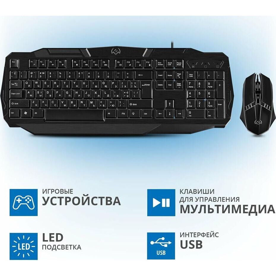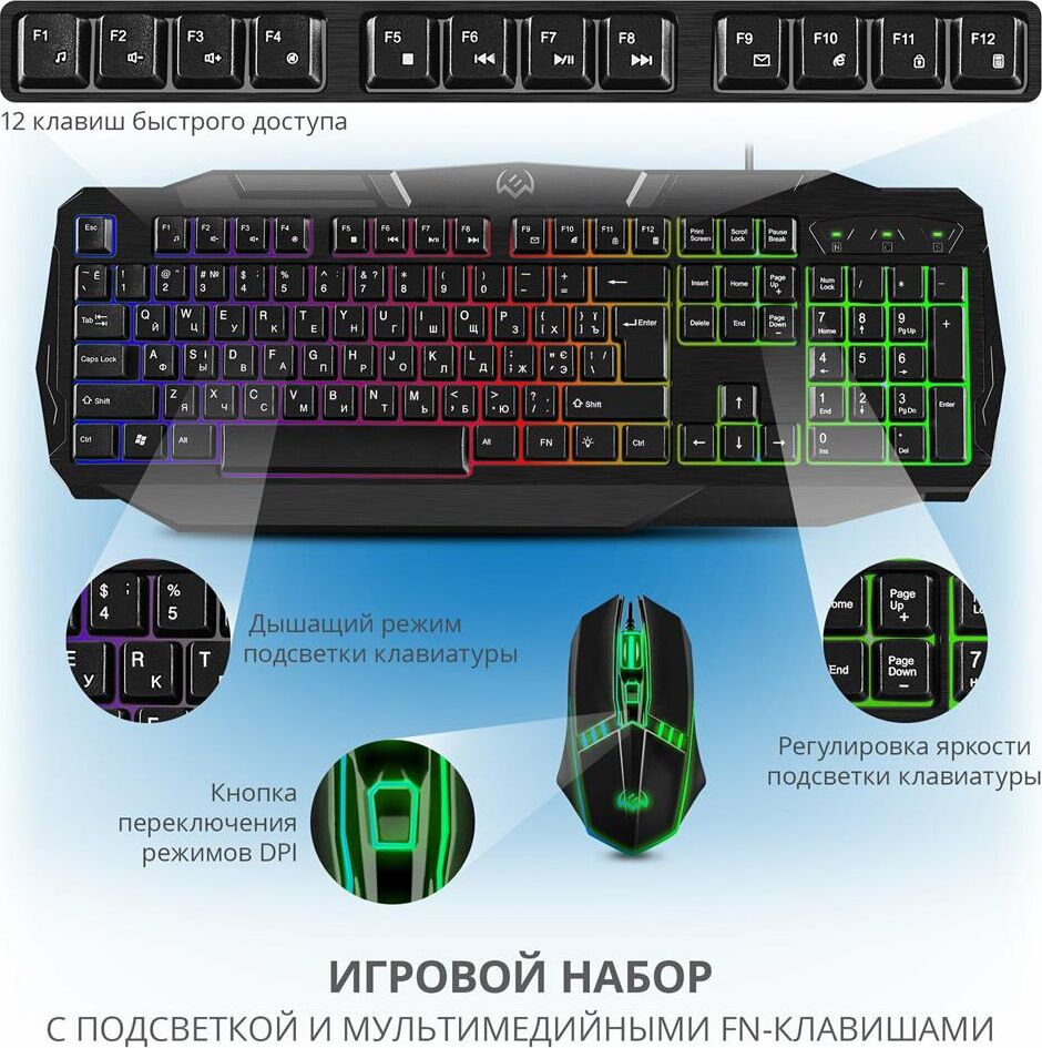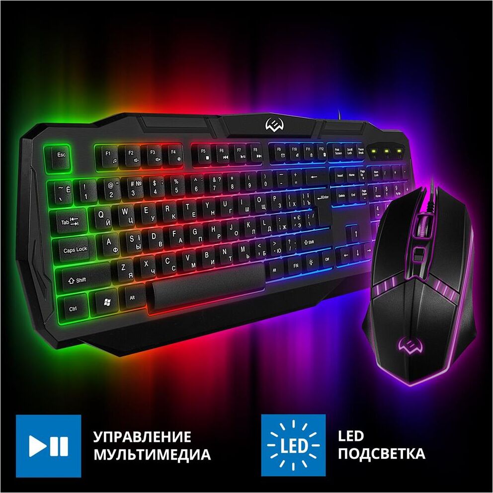 Геймерский набор (клавиатура+мышь), интерфейс USB, клавиатура -количество клавиш - 104 ,быстрого доступа - 12 шт, дышащий режим подсветки, длина кабеля -1,8 м; мышь - оптическая, проводная, количество кнопок - 3+1, изменяемое разрешение - 1000/1200/1600 dpi, динамическая подсветка корпуса.