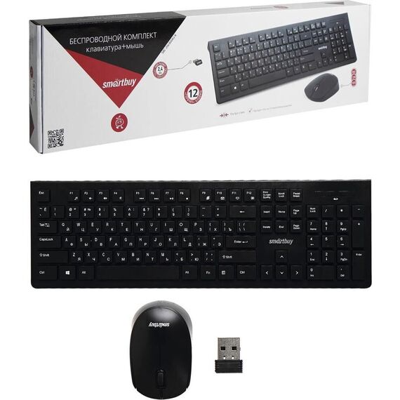 Комплект беспроводной (клавиатура+мышь), классическая раскладка клавиатуры; островной (ноутбучный) тип клавиш; мультимедийный функционал (12 горячих клавиш); симметричная мышь, 800-1200-1600 DPI; диапазон действия до 10 м