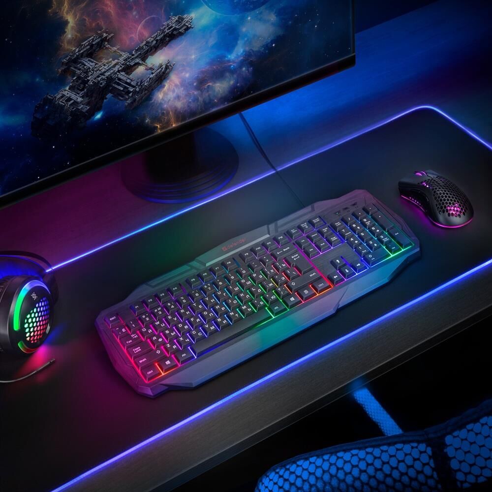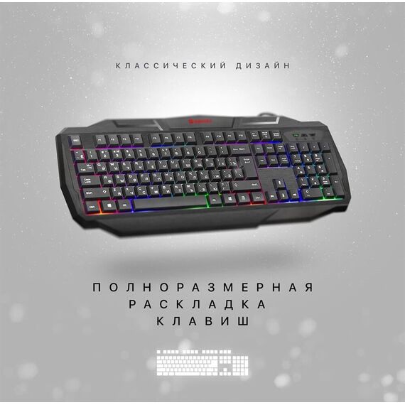 Клавиатура проводная, интерфейс подключения - USB, количество клавиш 104 шт., прочная усиленная конструкция, полноразмерная раскладка клавиш, радужная подсветка, ругклируемый угол наклона , длина кабеля - 1,5 м.