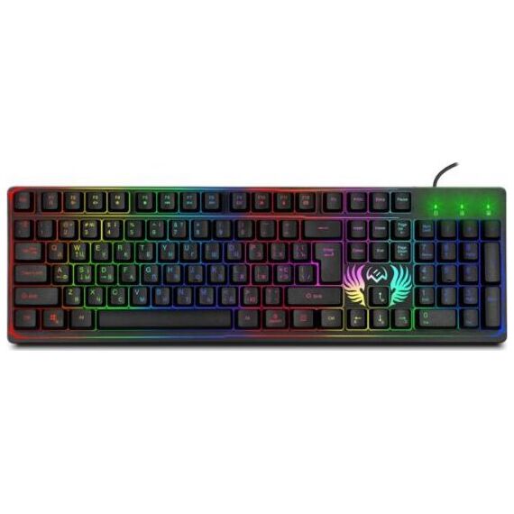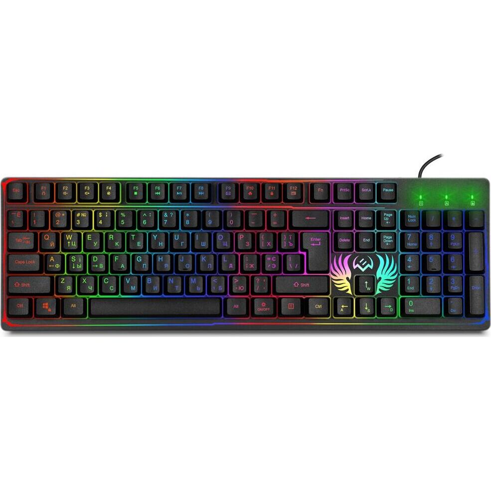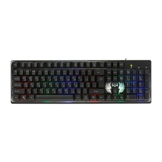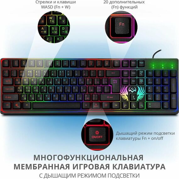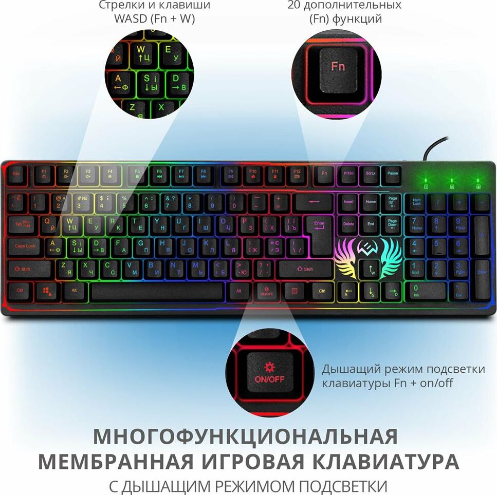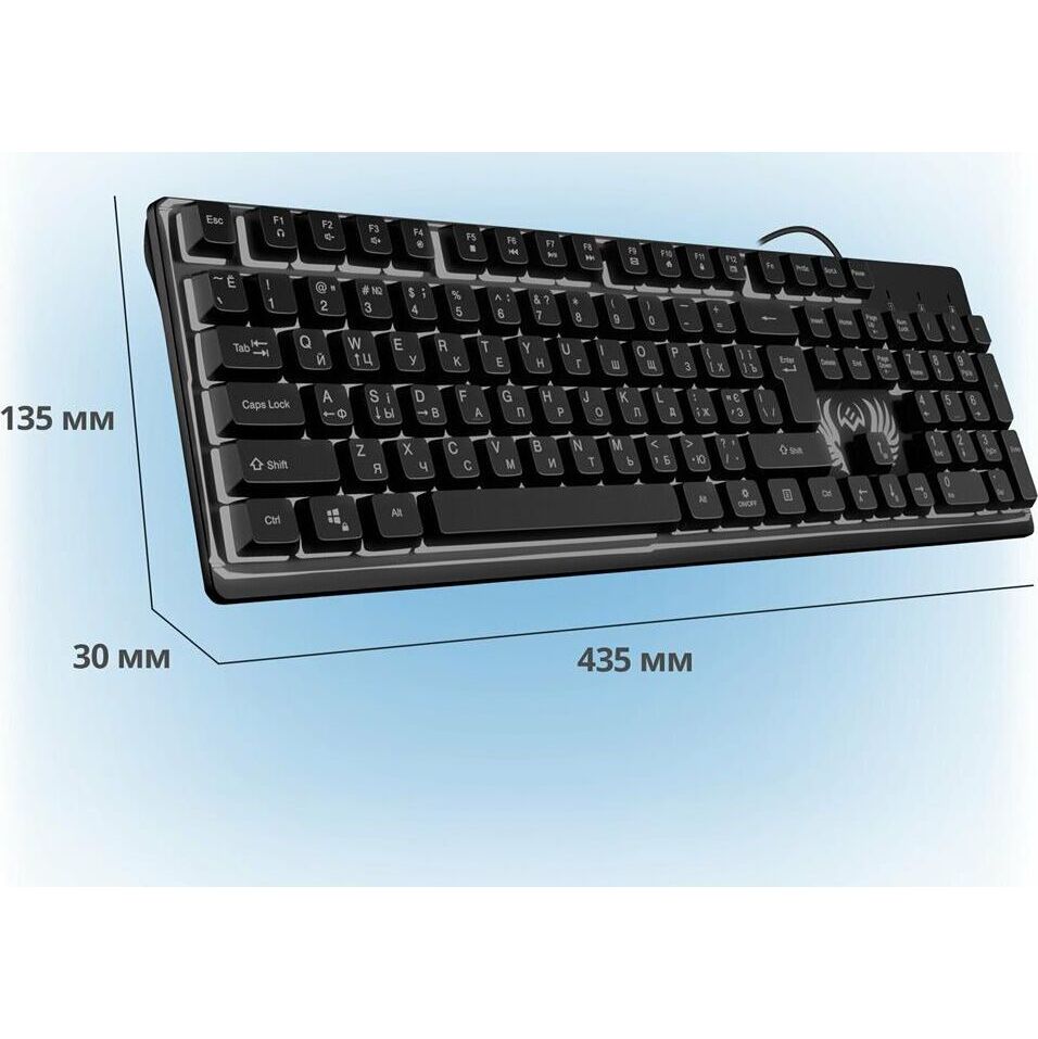 Клавиатура игровая, проводная. Оборудована разноцветной подсветкой с регулировкой яркости и «дышащим» режимом, позволяющей создать на игровом месте как агрессивную среду для онлайн-шутеров, так и атмосферу сосредоточения и концентрации для квестов и стратегий. 20 дополнительных (Fn) функций. Переключение режимов между клавишами WASD и стрелками. Количество клавиш - 105. Кол-во клавиш быстрого доступа - 20. Тип: мембранная. Интерфейс - USB. Длина кабеля - 1,8 м. Размеры изделия - 435*135*30 мм. Вес - 422 г.
