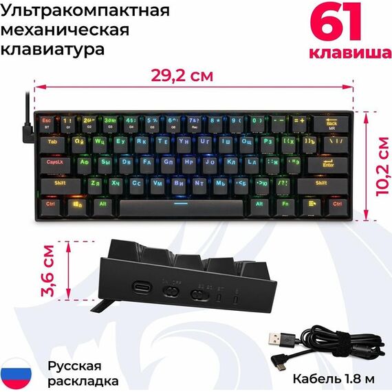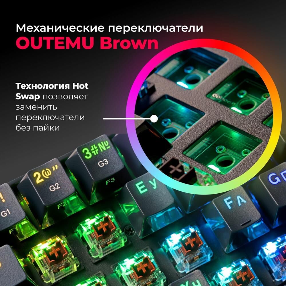Позолоченный USB-коннектор - Позолоченное напыление обеспечивает лучшую проводимость, меньшее сопротивление и окисляемость Аппаратная блокировка клавиши WIN во время игры Программируемая RGB подсветка Технология Hot Swap Влагоустойчивая конструкция клавиатуры Распознает одновременное нажатие 87 клавиш Технология Double injection - Символы не сотрутся, так как клавиши отлиты из двух цветов пластика: черный для области кнопки и белый/прозрачный для символов