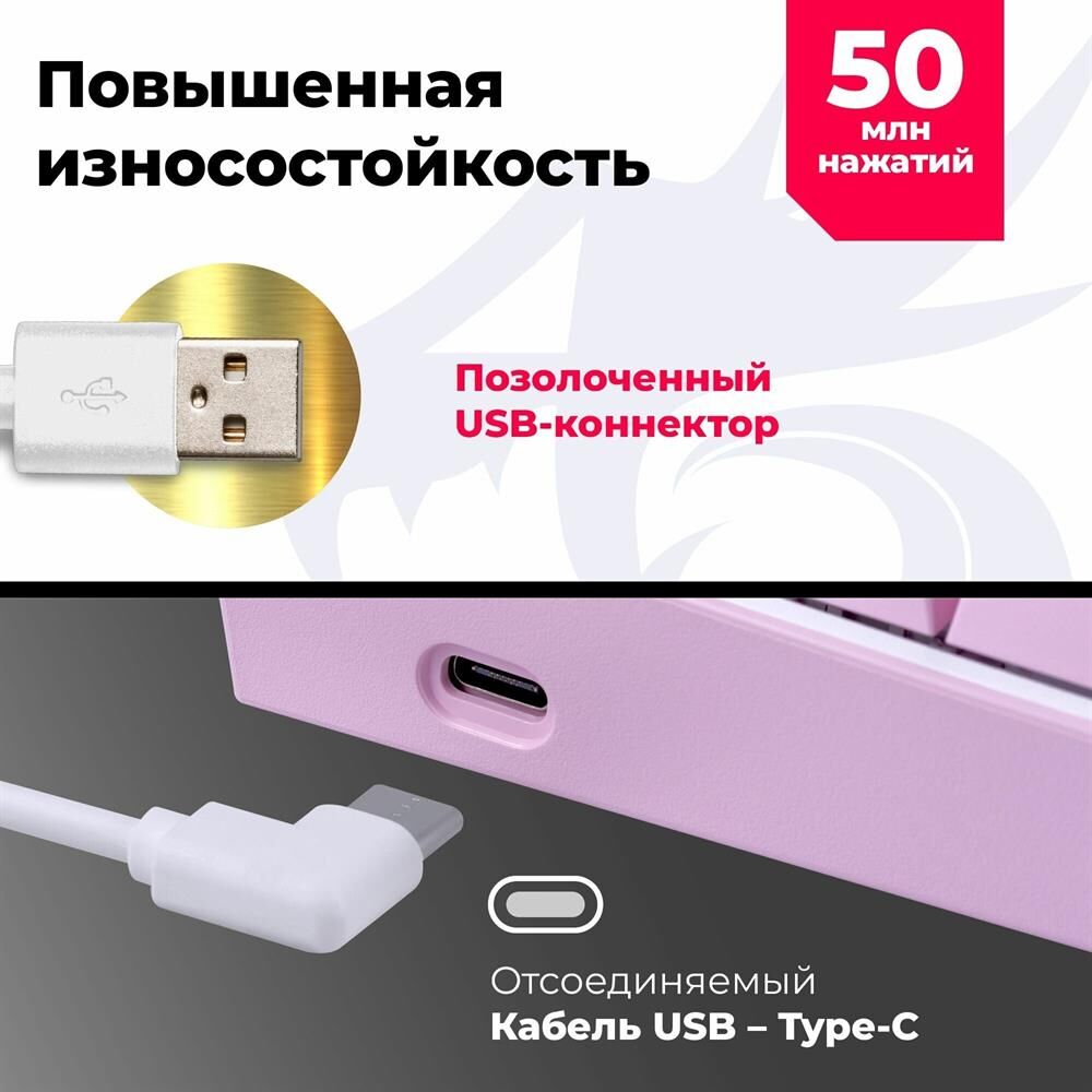 Повышенная износостойкость Позолоченный USB-коннектор - Позолоченное напыление обеспечивает лучшую проводимость, меньшее сопротивление и окисляемость Радужная подсветка Технология Hot Swap Влагоустойчивая конструкция клавиатуры Тихий ход клавиш обеспечивает практически бесшумную работу
