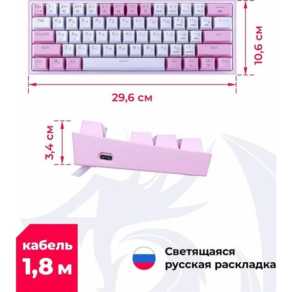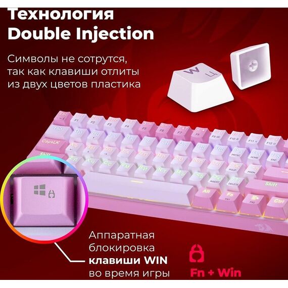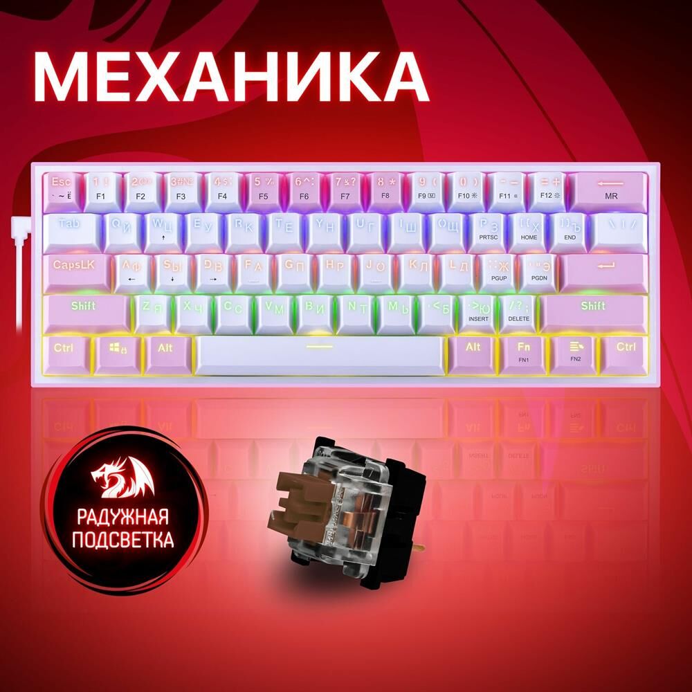 Клавиатура REDRAGON (70672) Fizz Радужн,61 клав,тих,бело-розов.