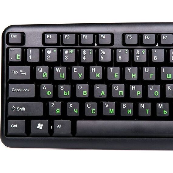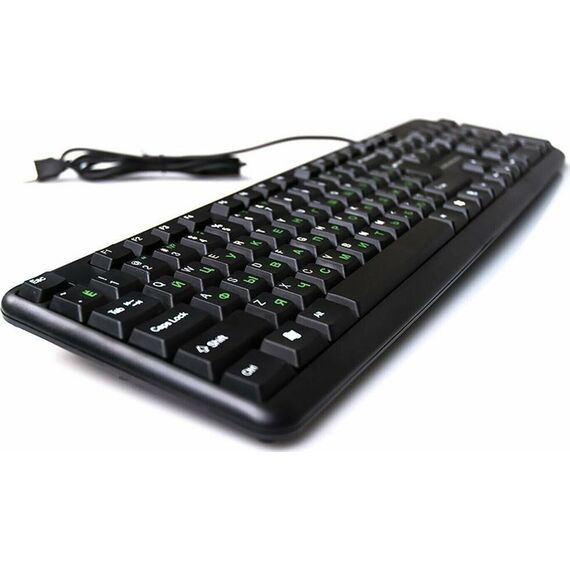 Интерфейс: USB, Корпус: Пластик, черный. Латиница - белый цвет, кириллица - зеленый, Количество клавиш: 104, Клавиши Windows, Регулируемый угол наклона, Длина кабеля, м: 1.5.