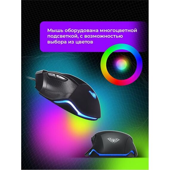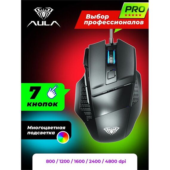 Мышь проводная, подсветка 4 цвета (синий, розовый, красный, фиолетовый), 7 кнопок, 800/1600/2400/3200/4800 dpi, кабель 1,8м, 117*77*39мм