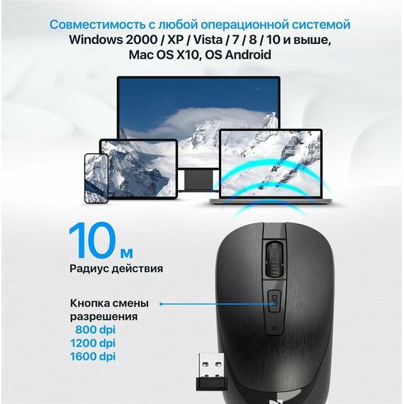 Тип подключения: беспроводной Интерфейс подключения: USB Количество кнопок: 3 + колесо-кнопка Тип сенсора: оптический Разрешение сенсора мыши, DPI: 800 / 1200 / 1600 Разрешение: 800/1200/1600 dpi Минимальное значение DPI: 800 dpi Максимальное значение DPI: 1600 dpi Количество нажатий: 5 миллионов Бесшумные кнопки: есть Тефлоновые ножки: есть Питание: 1 × AA Цвет: чёрный ROHS / CE: Да Радиус действия: 0–10 м Масса индивидуальной упаковки: 0.08 кг Масса без упаковки: 0.05 кг Размеры без упаковки: 5.5 x 3.8 x 10.5 см Системные требования для ПК: Windows 2000/XP/Vista/7/8/10 и выше, Mac OS X10 Гарантийный срок: 6 месяцев