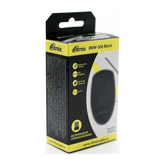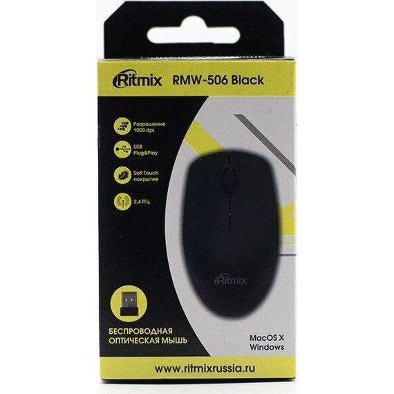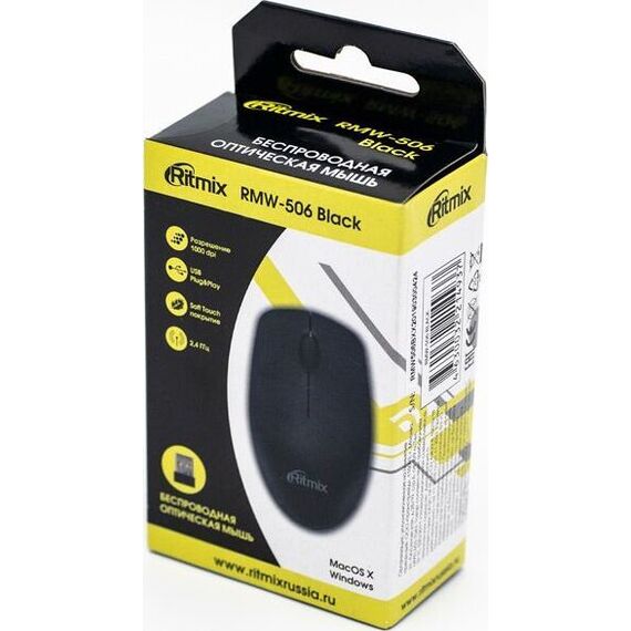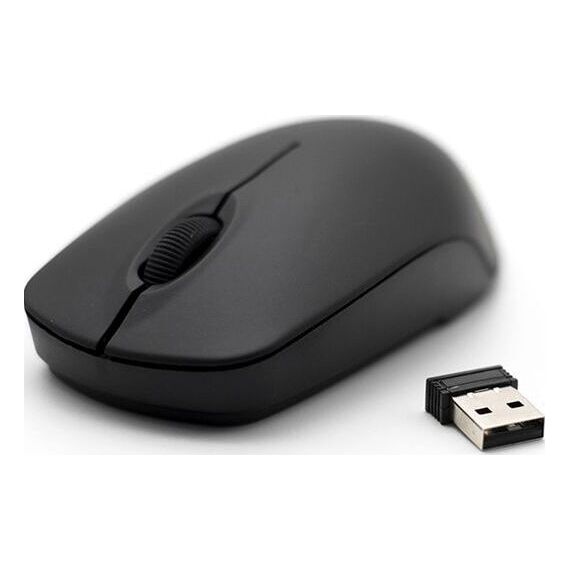 Мышь беспроводная, оптическая, 2 кнопоки , колесо-кнопка, оптическое разрешение 1000 dpi, интерфейс - беспроводной USB-адаптер, Soft Touch покрытие, цвет - черный.