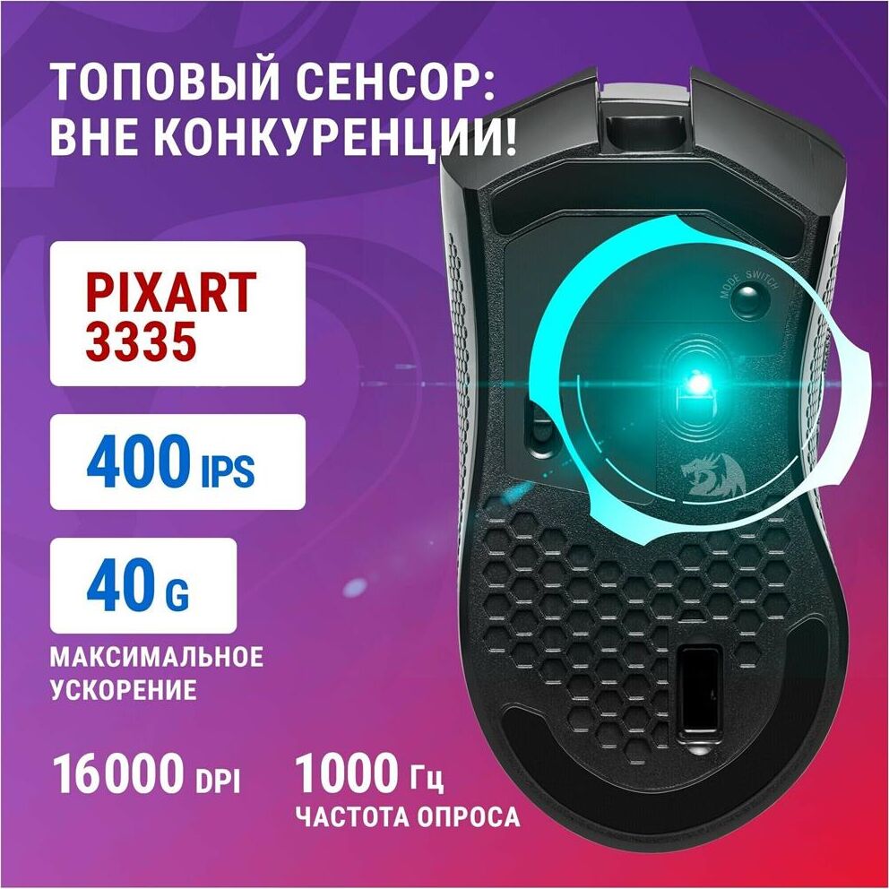 Мышь геймерская, беспроводная. Профессиональный оптический сенсор Pixart PAW3335, качественные переключатели и встроенный Li-Pol аккумулятор. Радиус действия до 15 м, игровое программное обеспечение, красивая подсветка.