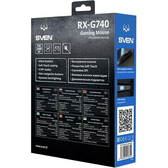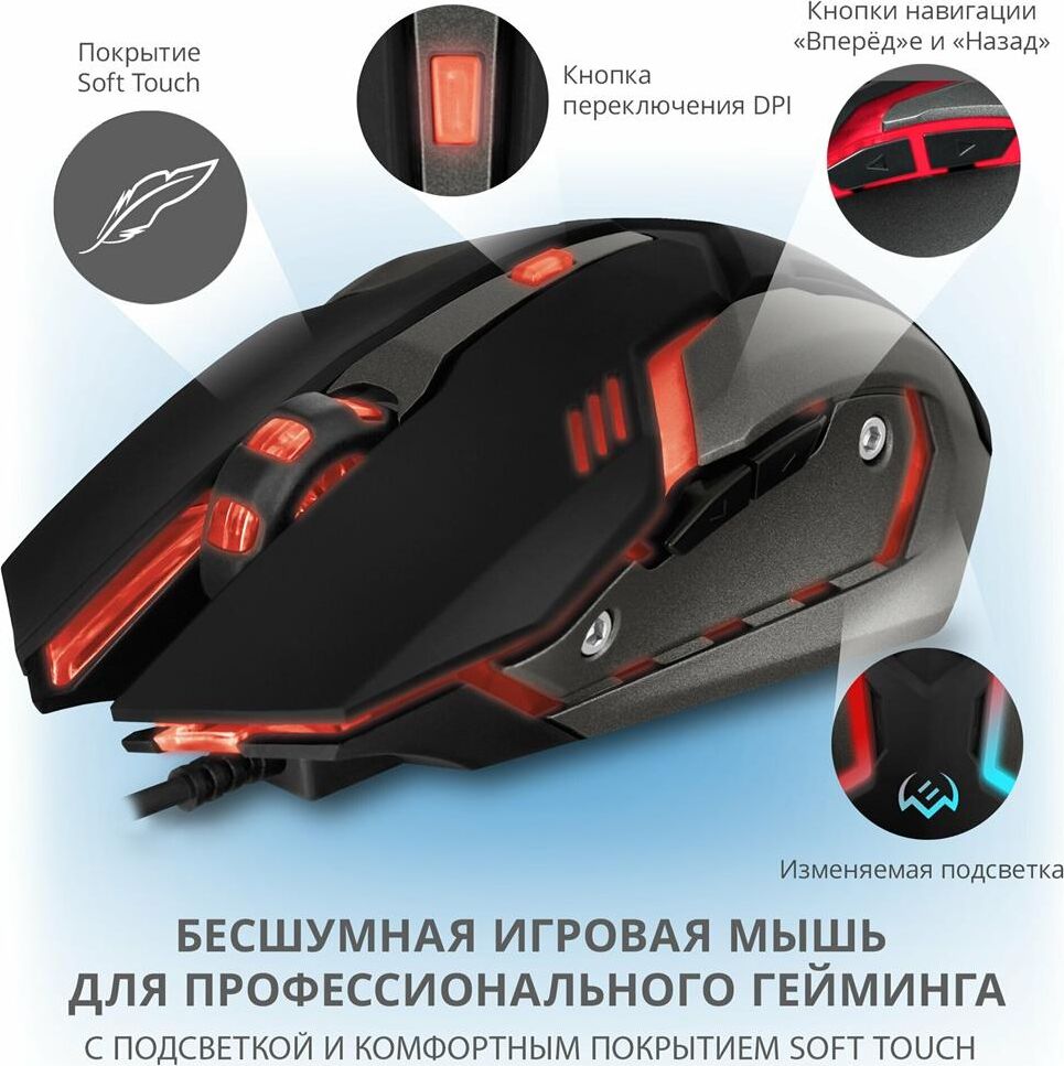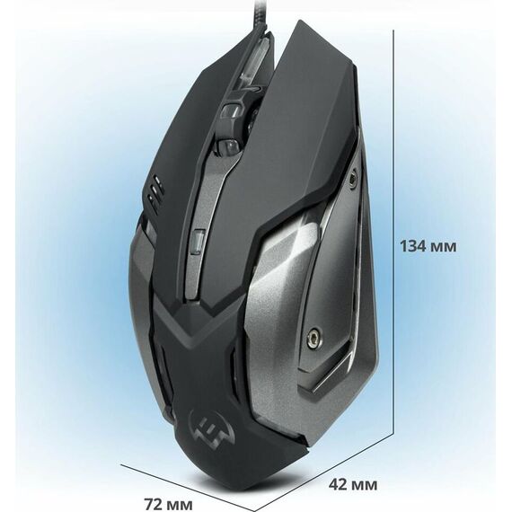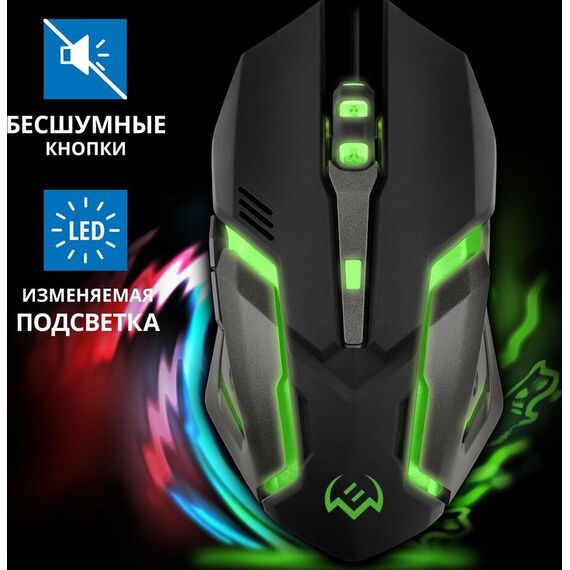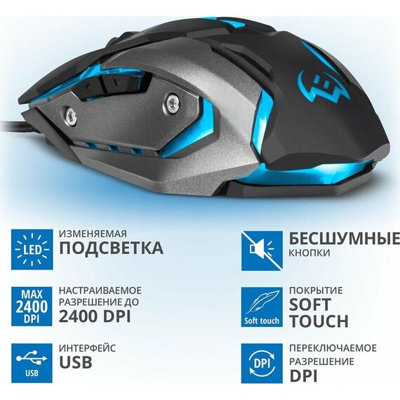 Игровая мышь с бесшумными кнопками, проводная, оптическая, Количество кнопок - 6, колесо прокрутки, разрешающая способность, DPI 800/1200/1800/2400, интерфейс - USB, боковые клавиши, навигации, мягкий бархат софт-тач покрытия, длина кабеля - 1,8 м.