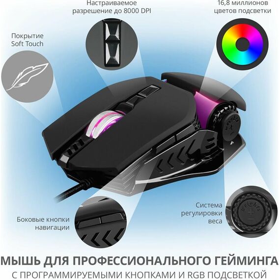 Игровая мышь , проводная, оптическая, количество кнопок - 6, колесо прокрутки, разрешающая способность, DPI 500-8000, интерфейс - USB, кнопки навигации, мягкий бархат софт-тач покрытия, изменяемая подсветка c возможностью управления цветовыми настройками, кабель в тканевой оплетке, длина кабеля - 1,8 м.