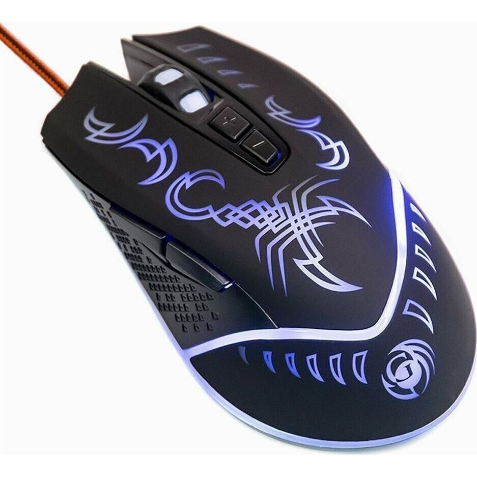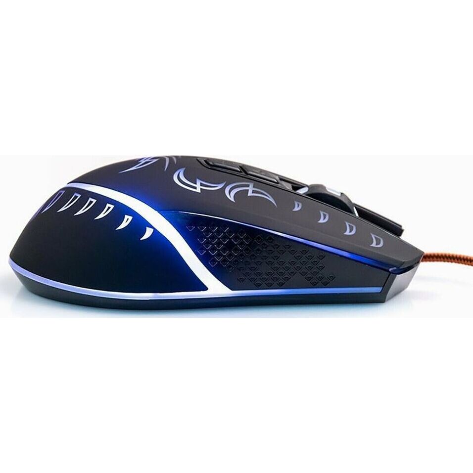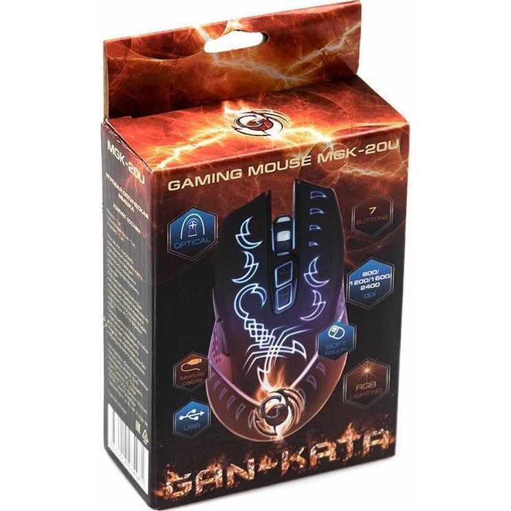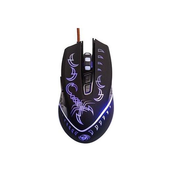 Мышь игровая, проводная, оптическая, интерфейс USB, 7 кнопок, колесо прокрутки, изменяемое разрешение 800/1200/1600/2400 dpi,материал корпуса -чёрный пластик софт-тач, верхняя панель с кнопками, изменяемая подсветка, текстильная оплетка, длина кабеля - 1,5 м.