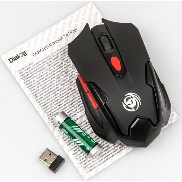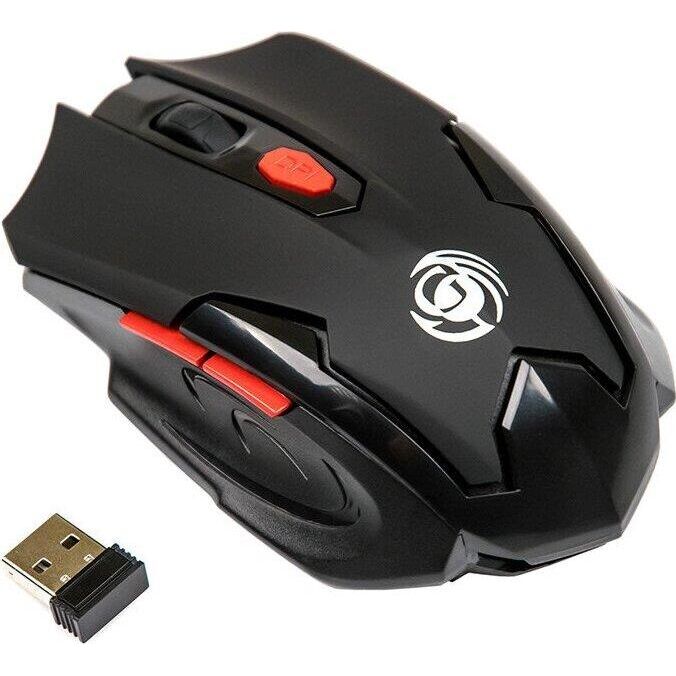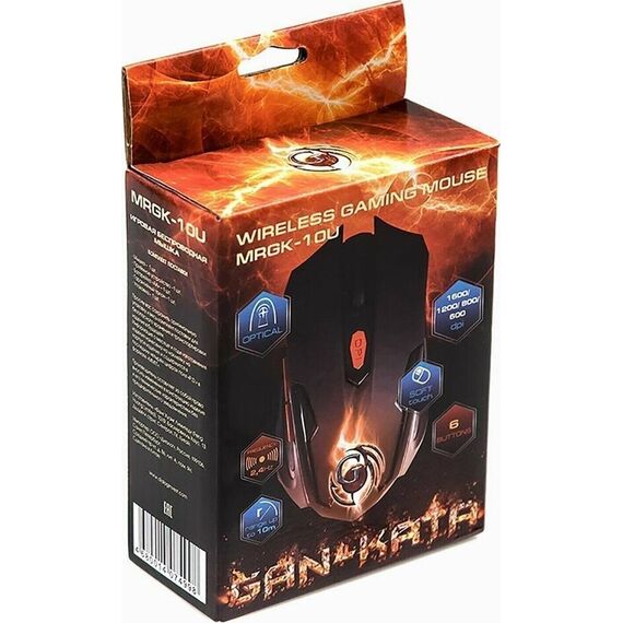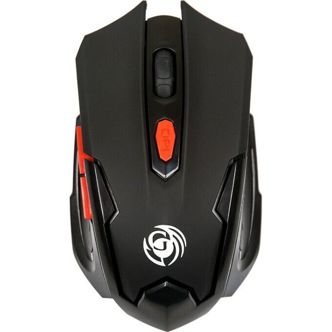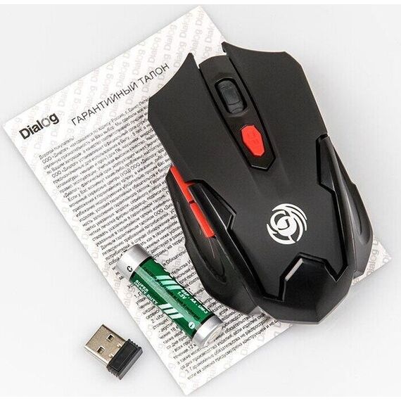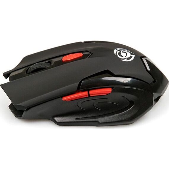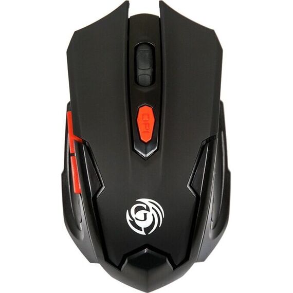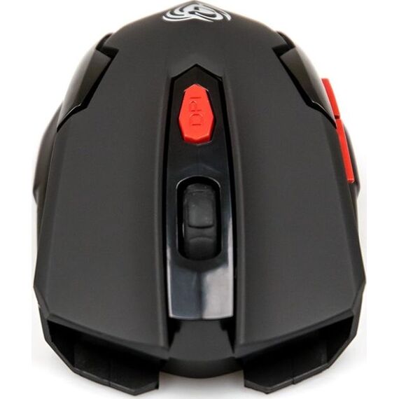 Мышь игровая, беспроводная, оптическая, радиоинтерфейс 2.4 гГц, динамически изменяемое разрешение 600/800/1200/1600, количество кнопок - 6, вертикальная прокрутка, материал корпуса - матовый черный пластик, верхняя панель с кнопками - пластик софт-тач, красные дополнительные кнопки.