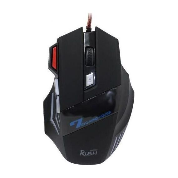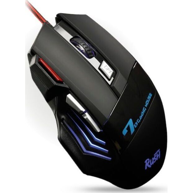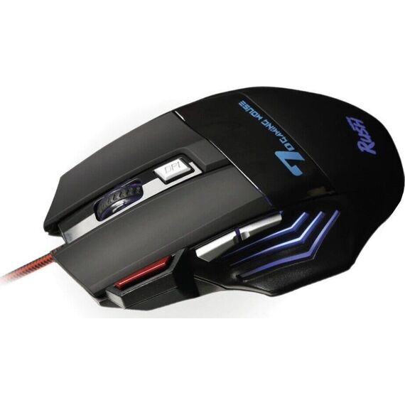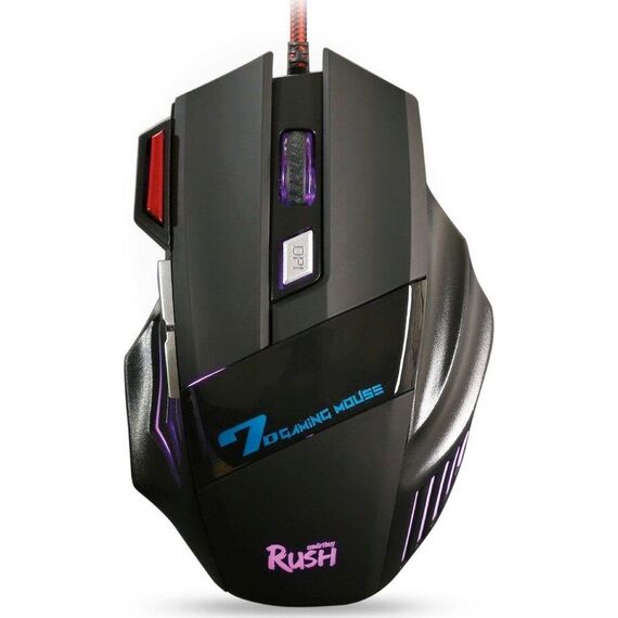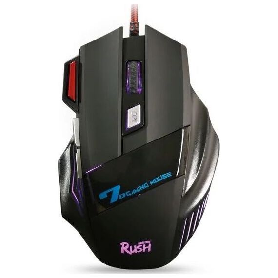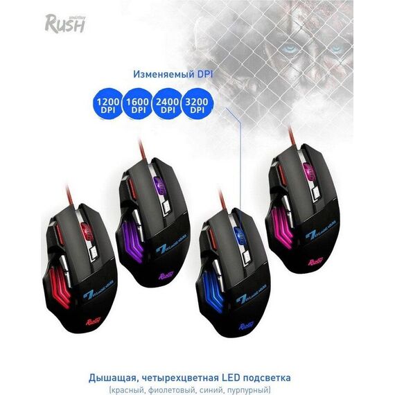 Мышь игровая, проводная, интерфейс USB, количество кнопок - 7 , изменяеоме разрешение 1200/1600/2400/3200 dpi, 4-х цветная LED-подсветка, металлическая пластина внутри корпуса мыши, кабель в текстильной оплетке с ферритовым фильтром, высококачественное покрытие софт-тач, длина кабеля - 1,5 м.