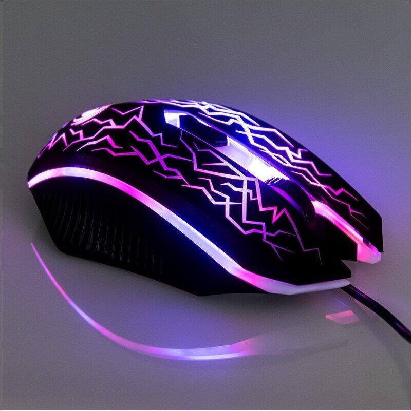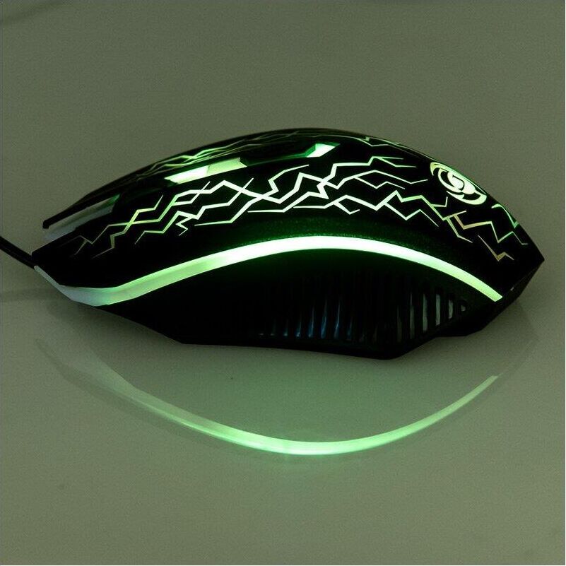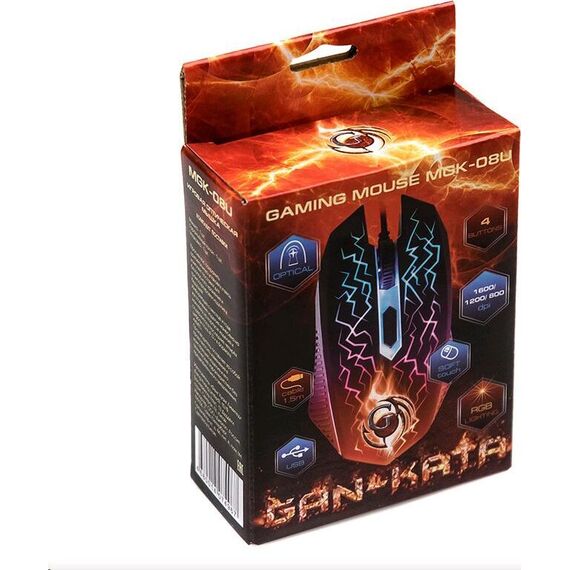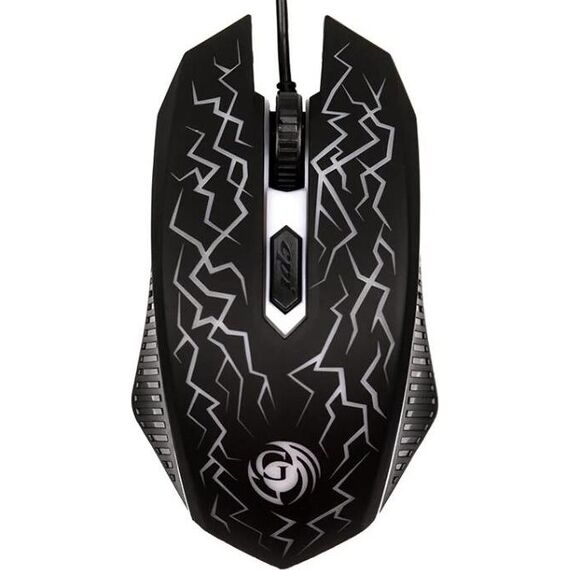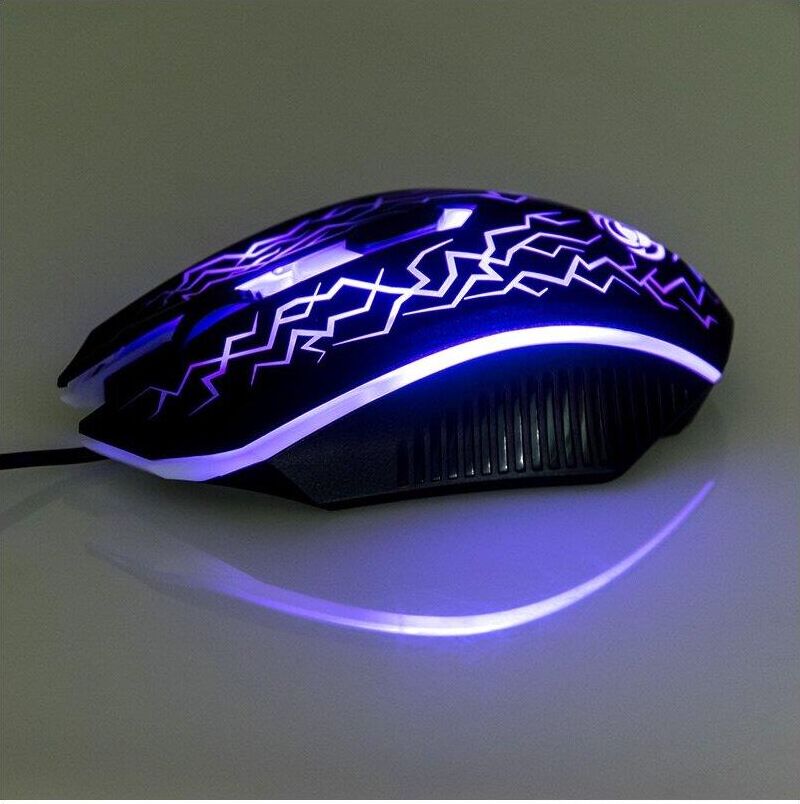 Игровая оптическая проводная мышь с подсветкой. Крупная симметричная мышь - подходит одинаково и для правшей, и для левшей. Подсветка красная, зеленая, синяя, фиолетовя, голубая - сменяется циклически. Матовый черный пластик, верхняя панель с кнопками - пластик софт-тач. Вставки из полупрозрачного светлого пластика (подсветка). Динамически изменяемое разрешение циклически центральной кнопкой (800/1200/1600 dpi). Количество кнопок - 4. Длина шнура - 1,5 м. Размер - 125*70*33 мм. Вес - 71 г.