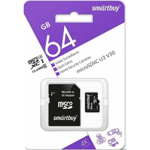 Карта памяти SMARTBUY (SB64GBSDCCTV) micro SDXC 064GB cl10 U3 V30 + адаптер