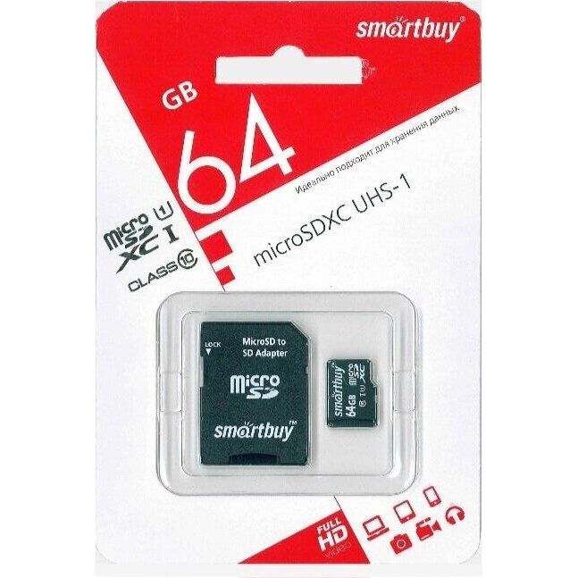 Карта памяти SMARTBUY (SB64GBSDCL10-01) MicroSDXC 64GB Class10 UHS-1 + адаптер
