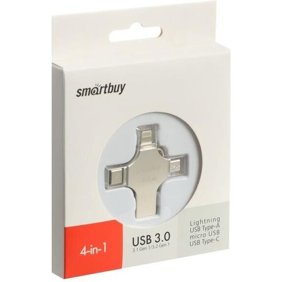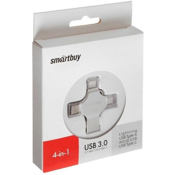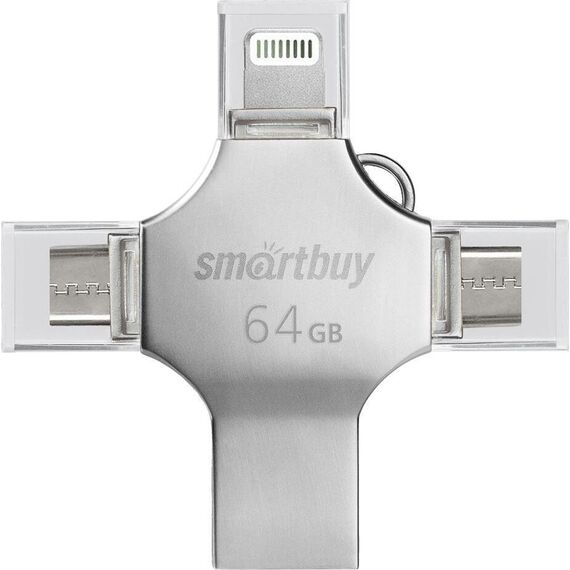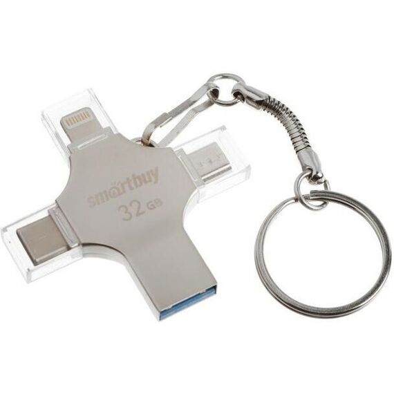 Быстрая универсальная USB3.0 металлическая флешка с 4-мя разъемами. Кольцо для крепления на ключи в комплекте. Скорость чтения 90. Макс скорость записи 29