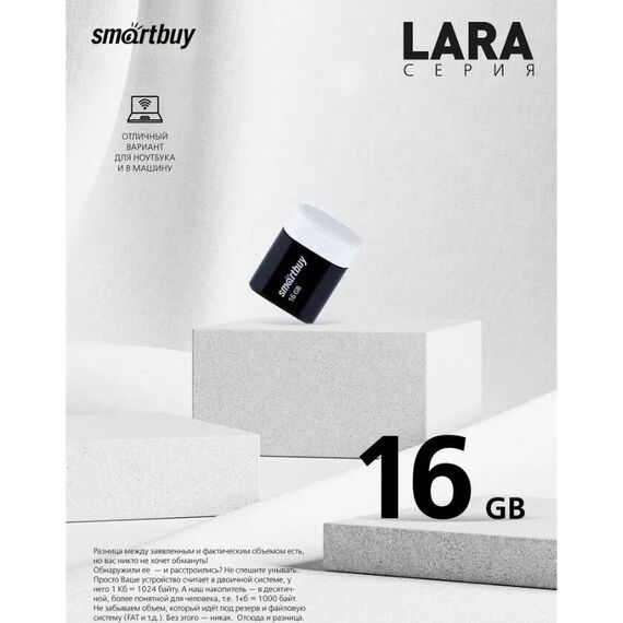Компактный флэш-накопитель LARA , объем 16 ГБ, интерфейс подключения USB 2.0, скорость чтения данных 15 МБ/с, скорость записи данных 5 МБ/с, материал корпуса - пластик