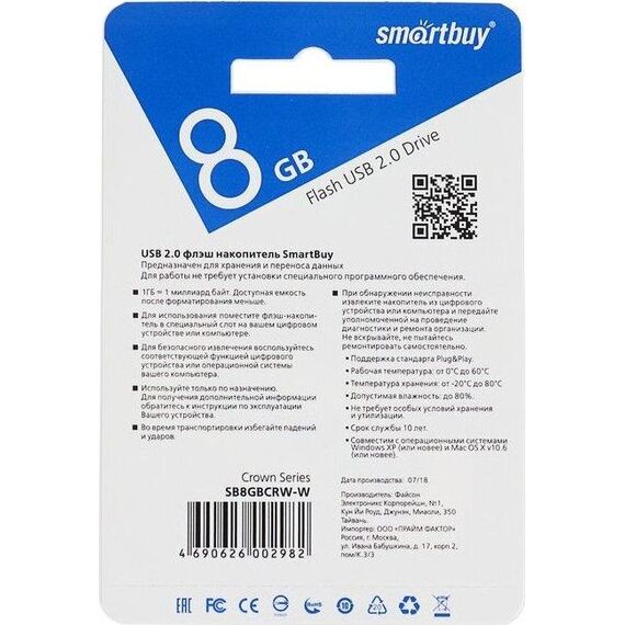 В дизайне Crown - простота и стиль, емкость 8GB, интерфейсUSB 2.0, отверстие для шнурка позволяет прикрепить накопитель к вашему телефону или связке ключей, чтобы он всегда был под рукой, дизайн устройства предусмотрен таким образом, что колпачок можно прикрепить сзади корпуса.