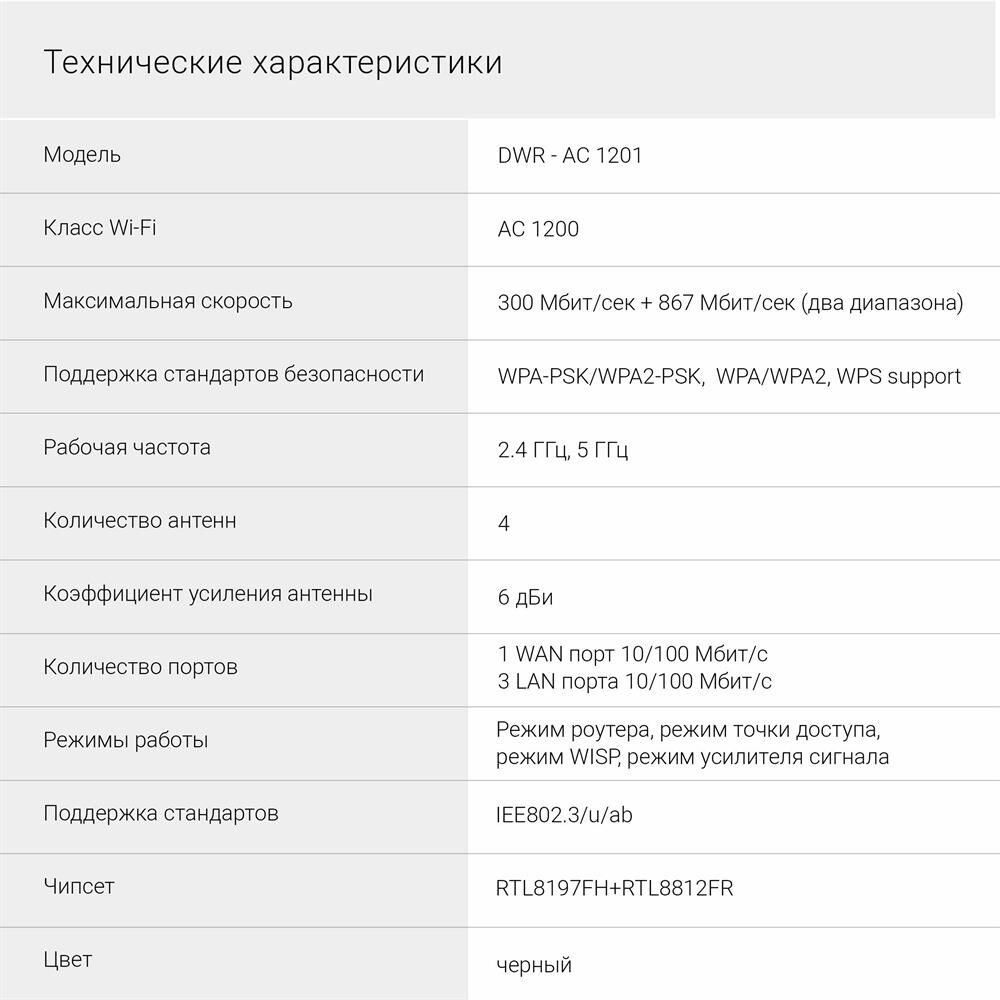 Технические характеристики Количество диапазонов двухдиапазонный Стандарт Wi-Fi 802.11a, 5 ГГц ДА Стандарт Wi-Fi 802.11ac, 5 ГГц ДА Скорость 802.11ac, 5 ГГц 867 Мбит/с Стандарт Wi-Fi 802.11b ДА Стандарт Wi-Fi 802.11g ДА Стандарт Wi-Fi 802.11n, 2.4 ГГц ДА Скорость 802.11n, 2.4 ГГц 300 Мбит/с Стандарт Wi-Fi 802.11n, 5 ГГц ДА Стандарт WiMAX ДА Стандарт WEP ДА Стандарт WPA ДА Стандарт WPA2 ДА Основные характеристики Тип Беспроводной роутер Съемные антенны внешние, несъемные WEB-интерфейс управления ДА Максимальная скорость по всем Wi-Fi диапазонам 1167 Мбит/с Диапазон 5 ГГц ДА Диапазон 2.4 ГГц ДА Межсетевой экран (FireWall) ДА Класс Wi-Fi AC1200 Разъемы, интерфейсы Входной интерфейс 10/100BASE-TX Количество выходных портов 10 / 100BASE-TX 3 Кол-во портов WAN 1 Внешние антенны ДА Количество антенн 4 DHCP-сервер ДА Поддержка VPN ДА Поддержка динамического DNS ДА Поддержка протокола IPv6 ДА Поддержка UPnP ДА Поддержка WPS ДА Размеры, вес, цвет Цвет черный