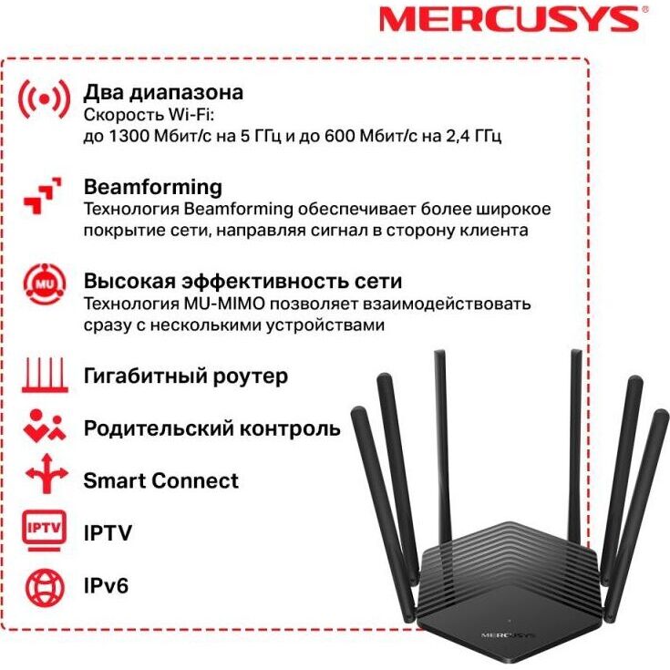 Wi-Fi роутер, 2.4/5 ГГц, стандарт Wi-Fi: 802.11ac, максимальная скорость: 1900 Мбит/с, 2xLAN 1000 Мбит/сек. Два диапазона AC1900 — наслаждайтесь домашними развлечениями без задержек на скорости до 1900 Мбит/с (1300 Мбит/с на 5 ГГц и 600 Мбит/с на 2,4 ГГц). Широкое покрытие — благодаря шести антеннам с высоким коэффициентом усиления и функции Beamforming стабильное Wi?Fi подключение будет во всём доме. Гигабитные порты — в полной мере воспользуйтесь интернет?подключением и передавайте данные на головокружительной скорости. Высокая эффективность сети — технология MU?MIMO позволяет MR50G взаимодействовать сразу с несколькими устройствами, что увеличивает общую пропускную способность сети. Smart Connect — переводит каждое устройство на лучший доступный диапазон