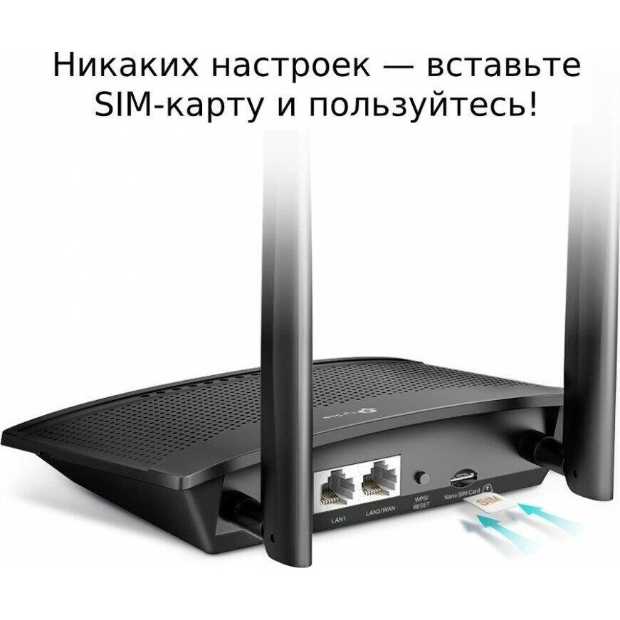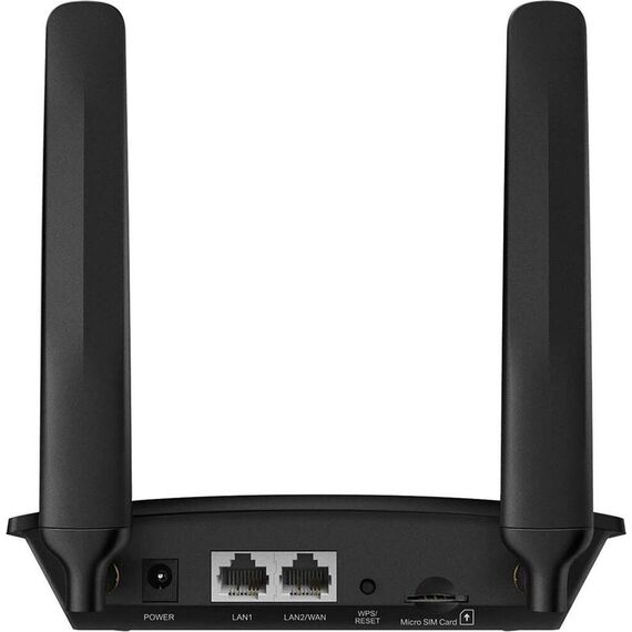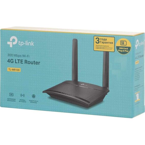 Подключение: SIM-карта 3G/4G, стандарт Wi-Fi: 802.11 b, g, n, частотный диапазон Wi-Fi: 2.4 ГГц, макс. скорость беспроводного соединения: 300 Мбит/с, LAN-портов: 2, съемных антенн: 2, мощность передатчика: 20 дБм , TL-MR100