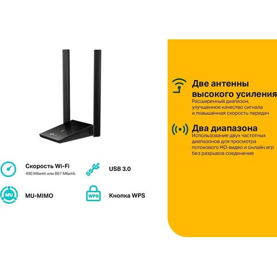 AC1300 Wi-Fi USB?адаптер с двумя антеннами высокого усиления. Ультраскоростной Wi-Fi — скорость до 1300 Мбит/с (400 Мбит/с на 2,4 ГГц и 867 Мбит/с на 5 ГГц) с использованием стандарта 802.11ac. Двухдиапазонный Wi-Fi — диапазоны 2,4 ГГц и 5 ГГц обеспечат гибкое подключение. MU-MIMO — увеличивает эффективность Wi?Fi подключения. Порт USB 3.0 — скорость передачи до 10 раз выше, чем у USB 2.0