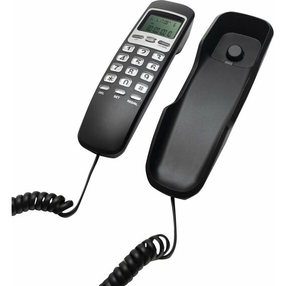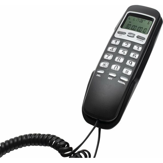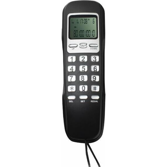 Проводной телефон с дисплеем, узкий корпус. Кнопки набора номера на базе. Пауза/ Повтор набора номера. Переключение. Системы определения номера входящего звонка (Caller ID), 32 входящих, 16 исходящих номеров в памяти. Импульсного /Тонового набора номера. Настольное и настенное крепление.