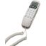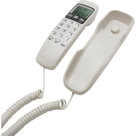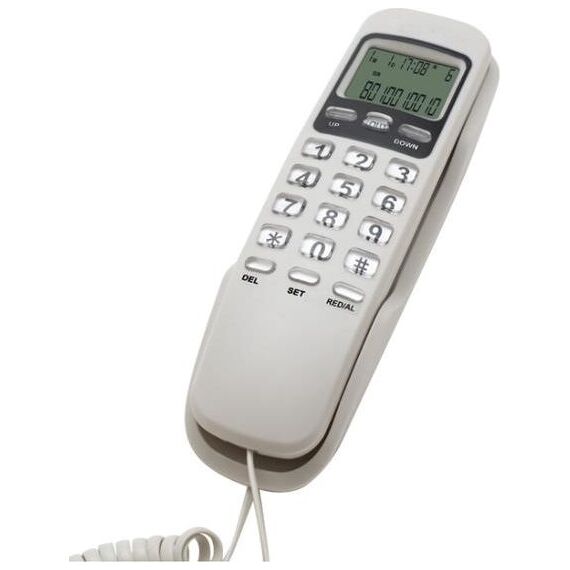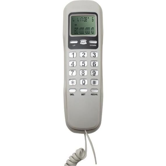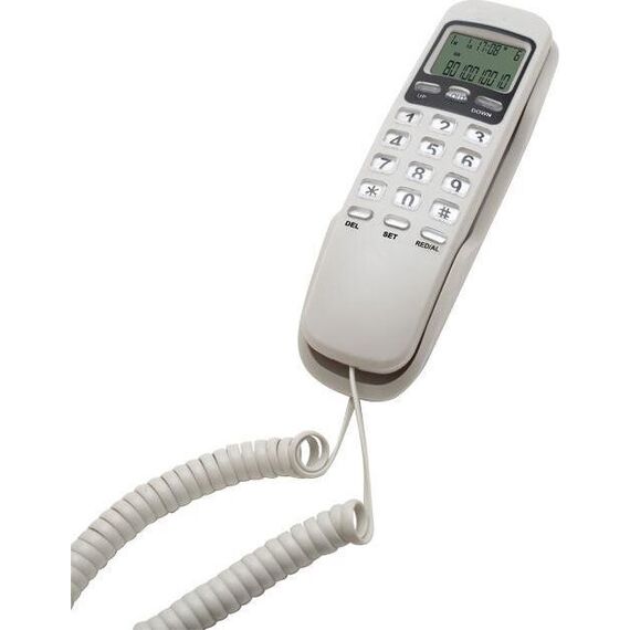 Проводной телефон с дисплеем, узкий корпус. Кнопки набора номера на базе. Пауза/ Повтор набора номера. Переключение. Системы определения номера входящего звонка (Caller ID), 32 входящих, 16 исходящих номеров в памяти. Импульсного /Тонового набора номера. Настольное и настенное крепление.