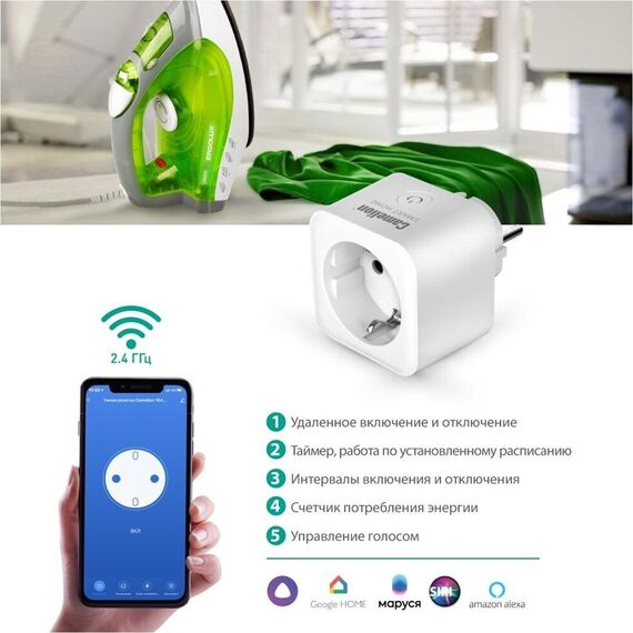 Умная розетка, Максимальная мощность нагрузки: 4000 Вт, Ток: 16 мА, Wi-fi: 2,4 ГГц, Напряжение: АС100-250V 50/60Hz В, Размеры: 82x45 мм, Голосовое управление: Siri, Алиса, Google, Маруся, Alexa, Управление через приложение на смартфоне: Camelion Smart Home (доступно в App Store, Google Play), Гарантия: 24 мес, Материал корпуса: поликарбонат, Особенности: Выключатель, таймер, счетчик электроэнергии, защита от детей, Цвет: Белый