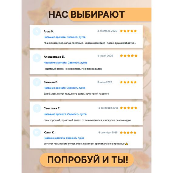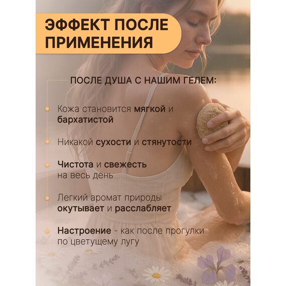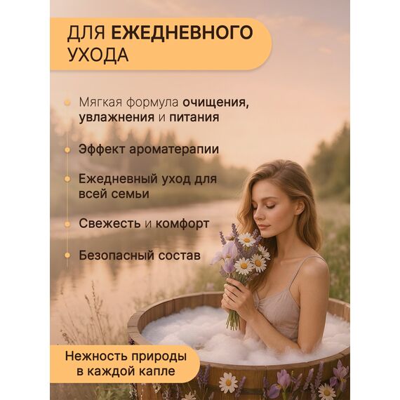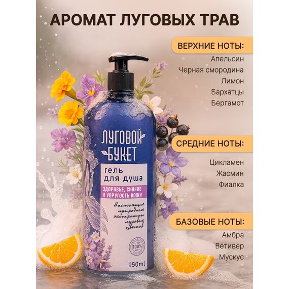 Позвольте себе ощущение утончённого уединения среди цветущих лугов в самом сердце природы с гелем для душа "Луговой Букет". Этот восхитительный запах  захватывает свежесть раннего утра на цветущей поляне, перенося вас в мир спокойствия и гармонии с первым же нанесением. Формула геля со сбалансированным pH составом, обогащенная глицерином мягко очищает, увлажняет и успокаивает вашу кожу, оставляя ощущение свежести и лёгкости на весь день. Изысканный аромат василька, ромашки, мелиссы и шалфея обрамлён тонкими нотками лаванды, что создаёт уникальный букет, погружая вас в спокойствие пасторальных пейзажей. Ощутите полноту и богатство луговых ароматов каждый день с гелем для душа "Луговой Букет".