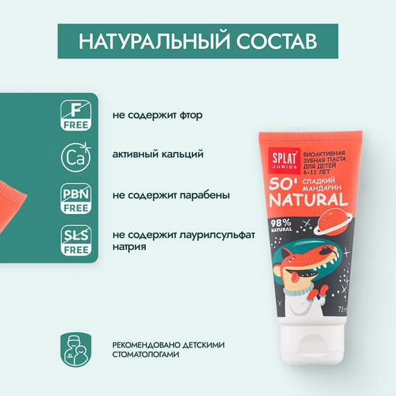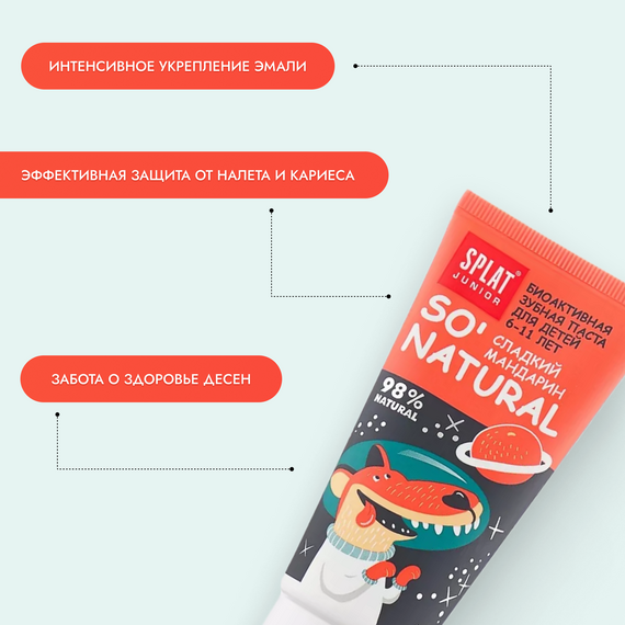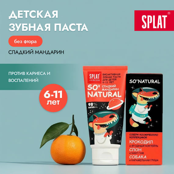 Детская зубная паста для чистки зубов Splat Junior "Сладкий мандарин" для детей от 6 до 11 лет. Эффективная, натуральная и безопасная детская зубная паста для защиты от кариеса, интенсивного укрепления эмали, заботы о деснах. Уникальная запатентованная система LUCTATOL® на основе экстракта японского лакричника до 96% сокращает образование зубного налета и уничтожает кариесогенные бактерии, способствуя защите от кариеса. Гидроксиапатит кальция (HAP), сходный по составу с зубной эмалью, обеспечивает интенсивное укрепление детской эмали зубов. Гель Алоэ Вера, экстракты коры магнолии, клюквы и граната, витамины А и Е обладают антиоксидантными и противовоспалительными свойствами.