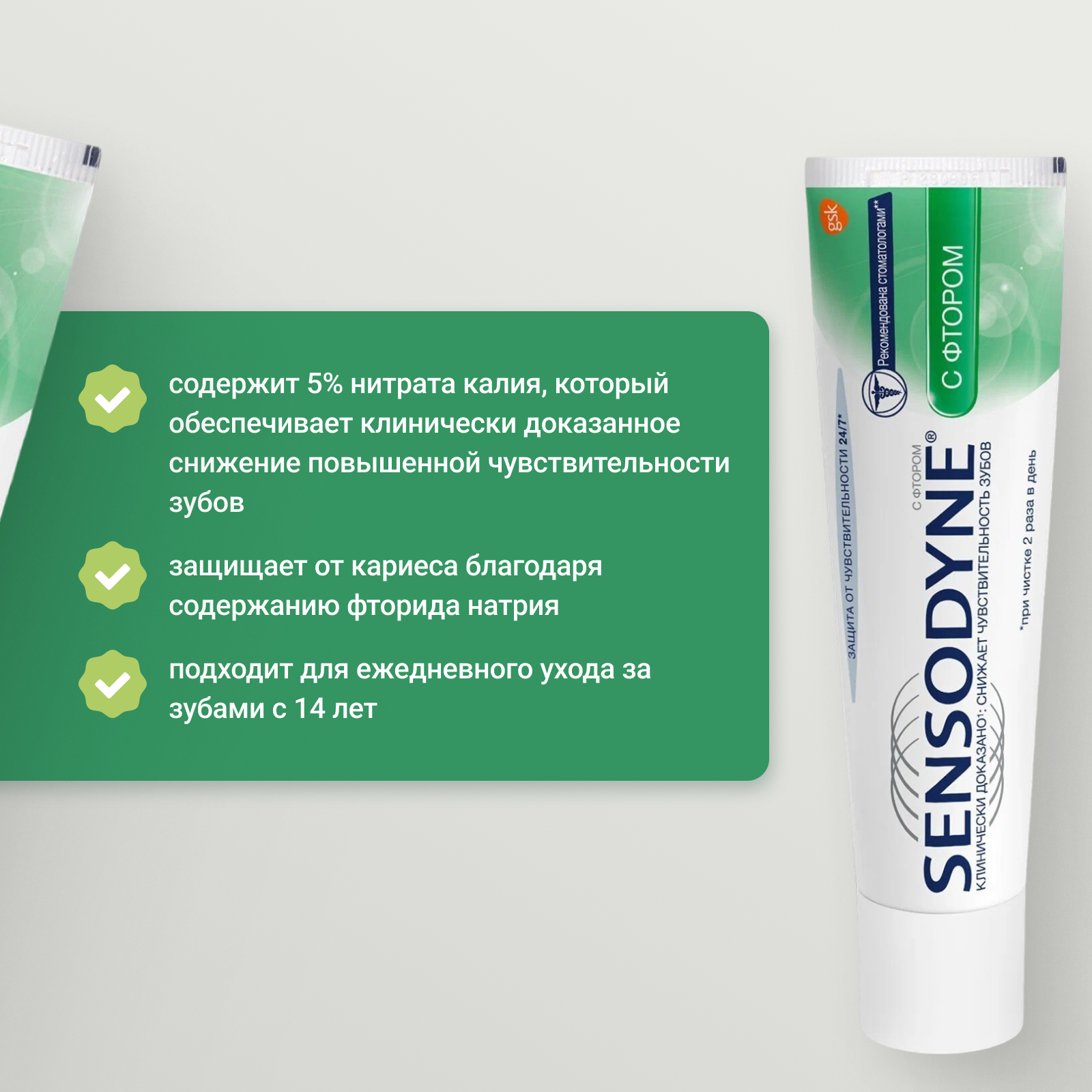 Зубная паста Sensodyne С фтором. Эффективно снижает чувствительность зубов и обеспечивает защиту от чувствительности в течение всего дня. Защищает от кариеса благодаря содержанию фторида натрия.