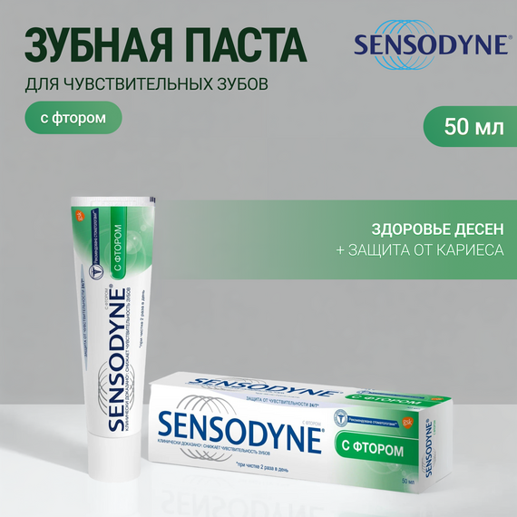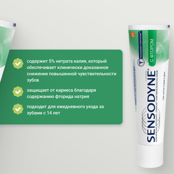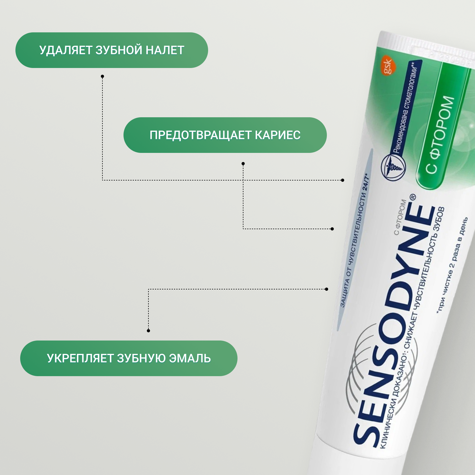 Зубная паста Sensodyne с фтором уменьшает болезненные ощущения, вызванные чувствительностью зубов, помогает предотвращать возвращение боли в дальнейшем*, а также защищает от кариеса благодаря содержанию фторида натрия.