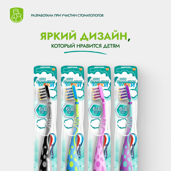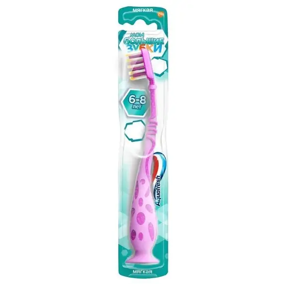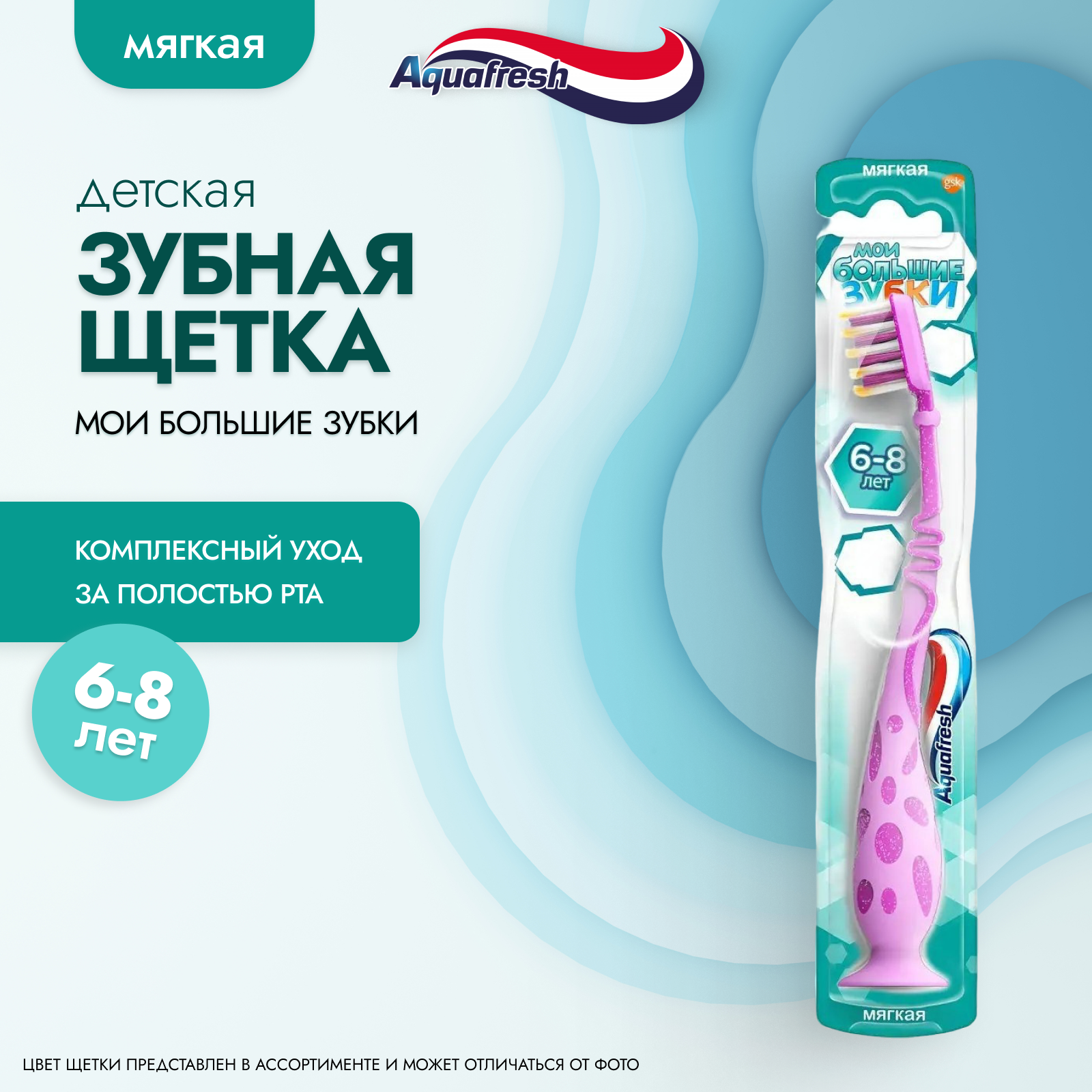 Aquafresh Зубная щетка детская MyBigTeeth Мои большие зубки, 6+ мягкая. Только что появившиеся постоянные зубы вашего ребенка имеют более мягкую эмаль, чем эмаль взрослого человека, и в большей степени подвержены повреждениям. Поэтому особенно важно обеспечить правильный уход за полостью рта ребенка в период смены молочных зубов на постоянные. Зубная щетка разработана специально для детей в возрасте от 6 до 8 лет. Щетка имеет щетинки разной длины, которые позволяют тщательно очистить промежутки между зубами, а стильный дизайн стимулирует развитие навыка правильного ухода за полостью рта. Крепление-присоска. Подвижная головка контролирует давление на зубы и предотвращает возможное повреждение зубной эмали и десен.