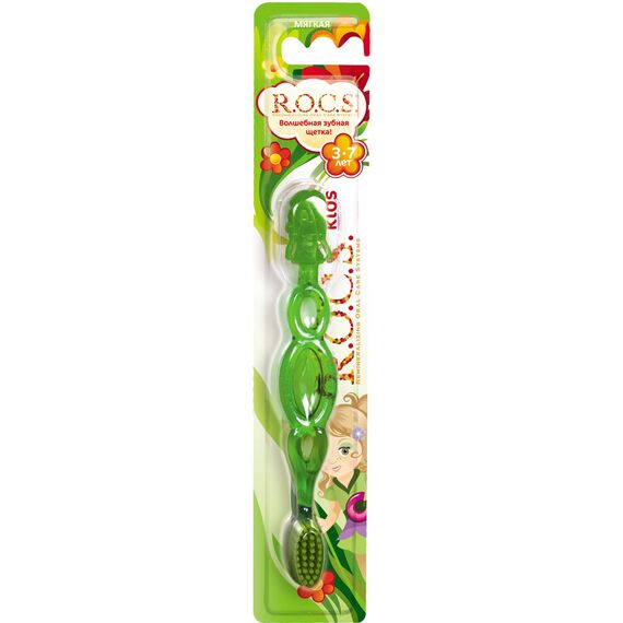 Необычная зубная щетка R.O.C.S. Kids предназначена для детей в возрасте от 3 до 7 лет. Она разработана при участии стоматологов, обеспечивает качественную гигиену полости рта и отличается необычным дизайном, который, наверняка, понравится ребенку. Экстрамягкая щетина с уникальной тройной полировкой кончиков обеспечивает бережный уход за нежными деснами и эмалью зубов малыша. Особая форма щетины с уникальным треугольным сечением образует 3 чистящих ребра, повышая эффективность чистки поверхности зубов. Способствует деликатному массажу десен, качественно и мягко удаляет зубной налет и очищает промежутки между зубами. Уникальная форма ручки, выполненная в форме волшебной палочки, превратит чистку зубов в увлекательную игру. Ручка из высококачественного и безопасного пластика. Структура пластика и однородность уменьшают уровень контаминации бактерий на поверхности ручки