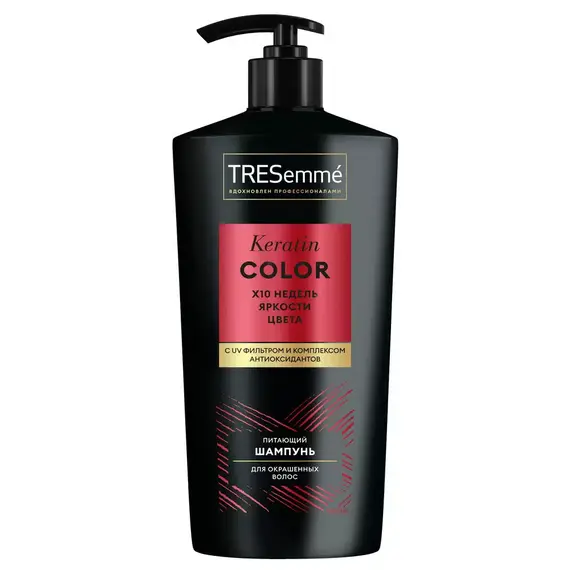 TRESemmé Keratin Color — шампунь для окрашенных волос, вдохновленный профессиональным уходом за волосами. Особая' формула шампуня с UV фильтром и комплексом антиоксидантов'' ухаживает за волосами и дарит видимый результат: до 10 недель яркости цвета ! Позаботьтесь о ваших волосах и сохраните роскошный оттенок вместе с шампунем для волос женским