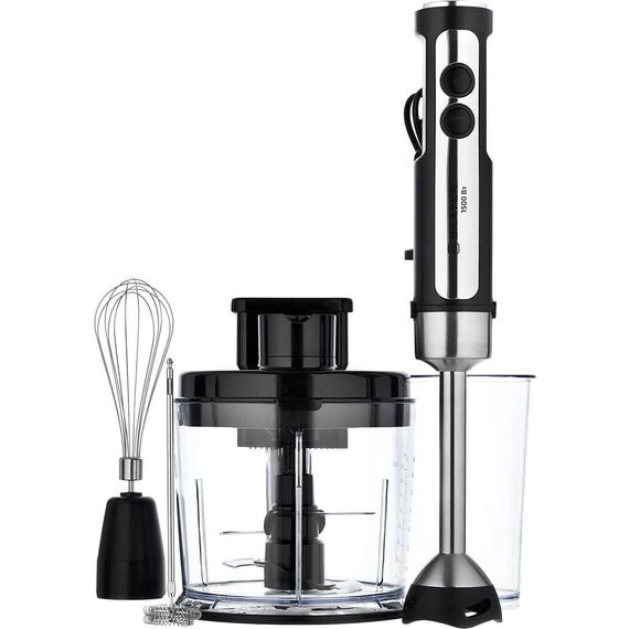 Мультифункциональный блендерный набор для измельчения, смешивания, шинковки и нарезки кубиками. Мощность 1500 Вт, Лезвия из титана. Погружная часть блендера с нейлоновым покрытием для предотвращения повреждения посуды. Корпус из пластика, декорирован нержавеющей сталью. Плавная регулировка скорости. Насадка-измельчитель объёмом 1,5 литра Диск для терки. Диск для шинковки. Насадка для нарезки продуктов кубиками S-образный нож из нержавеющей стали. Толкатель для чистки диска Насадка-венчик для взбивания. Стакан для смешивания 800 мл Насадка-блендер для измельчения и смешивания Капучинатор Электропитание 220-240 В, ~50-60 Гц