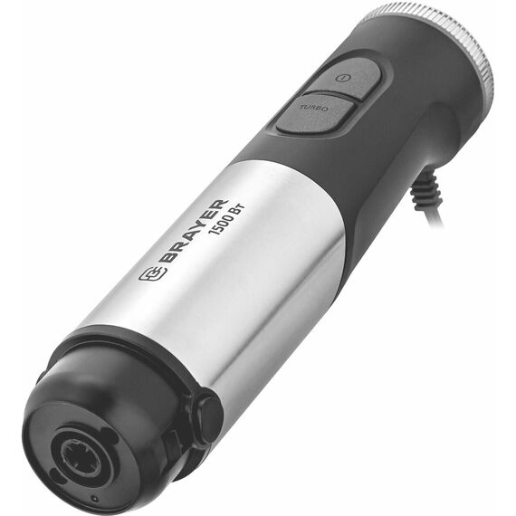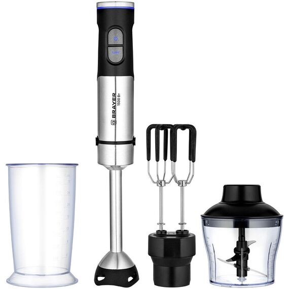 Мощность 1500 Вт Лезвия из титана Погружная часть блендера с нейлоновым покрытием для предотвращения повреждения посуды Корпус из пластика, декорирован нержавеющей сталью Плавная регулировка скорости Насадка-миксер для взбивания с нейлоновым покрытием для предотвращения повреждения посуды Стакан для смешивания 800 мл Насадка-блендер для измельчения и смешивания Насадка-измельчитель объемом 600 мл Электропитание 220-240 В, ~ 50-60 Гц