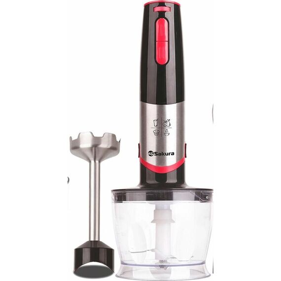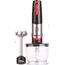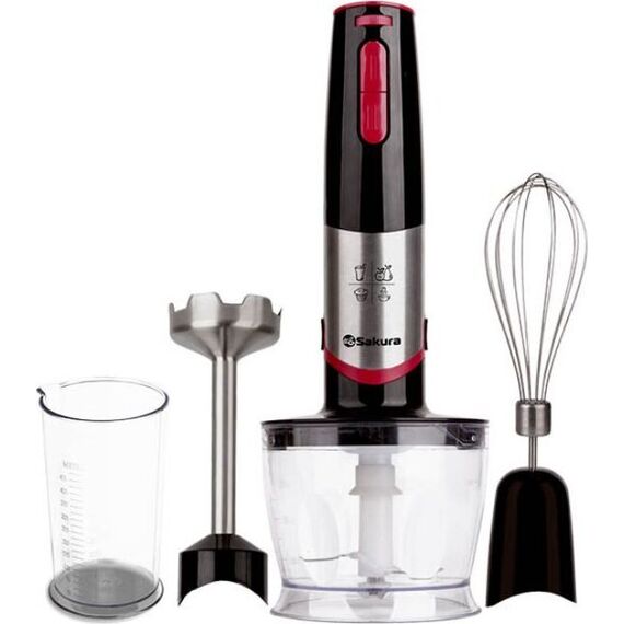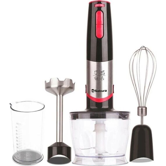 Блендерный набор, 800 Вт, мощный и тихий DC мотор, 2 скорости работы + дополнительная регулировка, острые лезвия из нержавеющей стали, 3 насадки (блендер, венчик, чоппер 0,5 л), стакан (0,5 л), погружная часть блендера из нержавеющей стали. Цвет: черный/красный.
